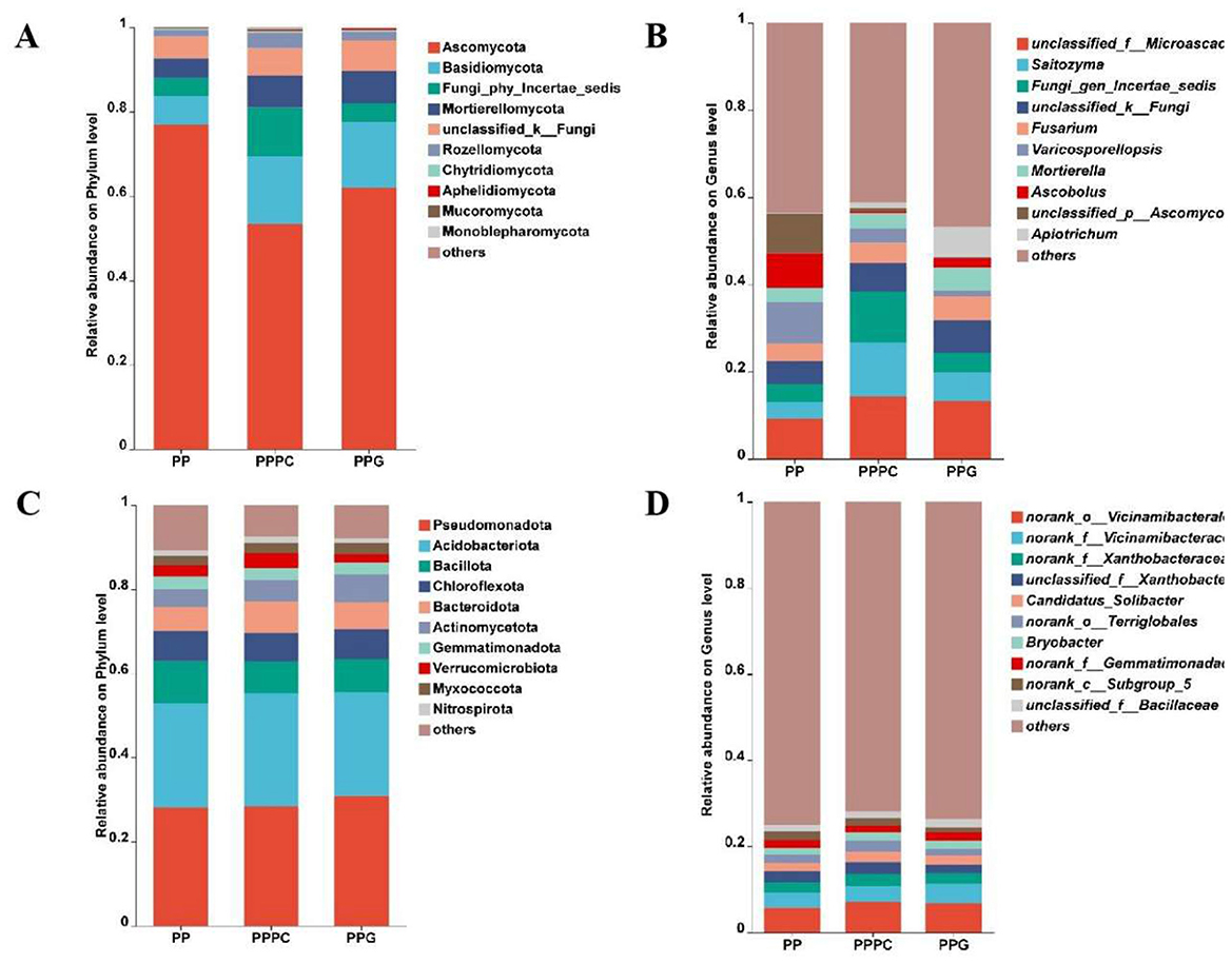 Figure 3. The effects of different intercropping patterns on the composition of fungal species in the rhizosphere soil of P. polyphylla. (A) Fungal phylum level; (B) Fungal genus level; (C) Bacterial phylum level; (D) Bacterial genus level. PP, Monoculture of P. polyphylla; PPPC, Intercropping of P. cyrtonema and P. polyphylla; PPG, Intercropping of P. polyphylla and G. lucidum.