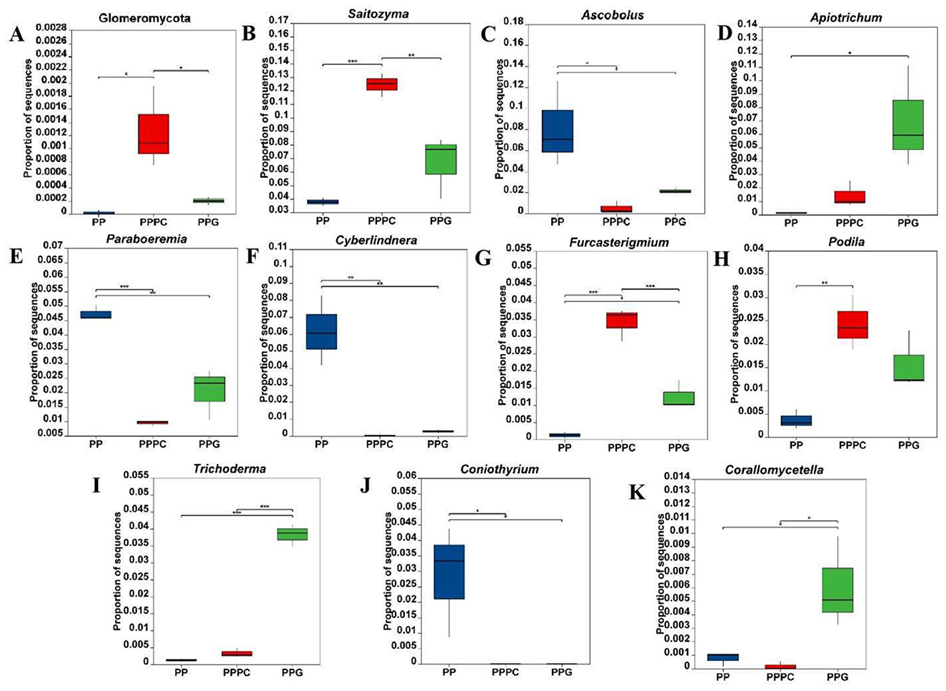 Figure 4. Relative abundance changes of differential fungi in the rhizosphere soil of P. polyphylla under different intercropping patterns. (A) Phylum level; (B-K) Genus level. PP, Monoculture of P. polyphylla; PPPC, Intercropping of P. cyrtonema and P. polyphylla; PPG, Intercropping of P. polyphylla and G. lucidum. * indicates a significant difference between the two groups (*P < 0.05; **P < 0.01; ***P < 0.001).