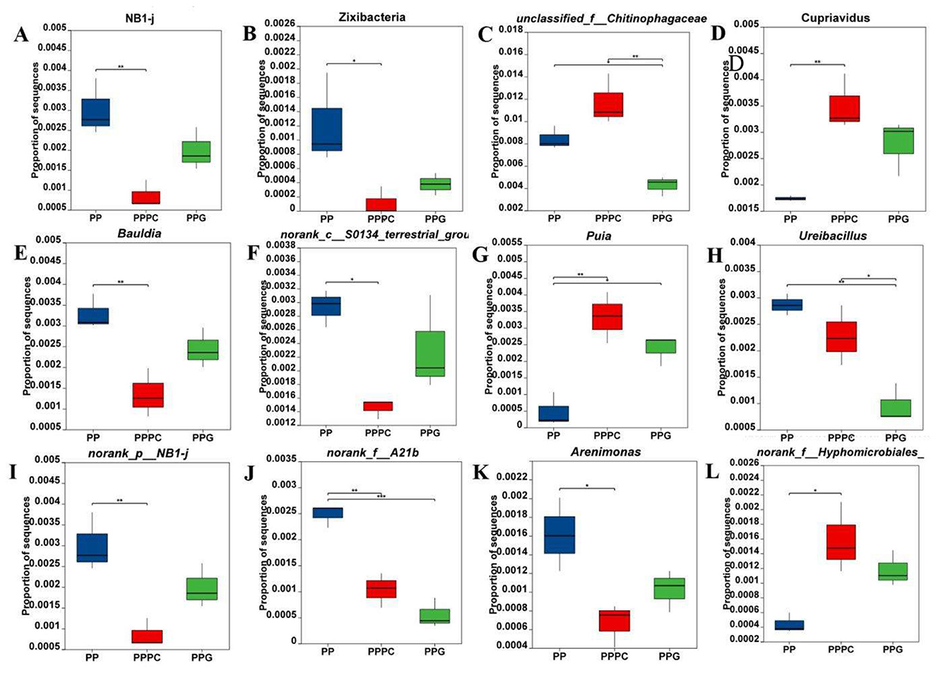 Figure 5. Changes in relative abundance of differential bacteria in rhizosphere soil of P. polyphylla under different intercropping modes (A, B) Phylum level; (C-L) Genus level. PP, Monoculture of P. polyphylla; PPPC, Intercropping of P. cyrtonema and P. polyphylla; PPG, Intercropping of P. polyphylla and G. lucidum. * indicates a significant difference between the two groups (*P < 0.05; **P < 0.01; ***P < 0.001).