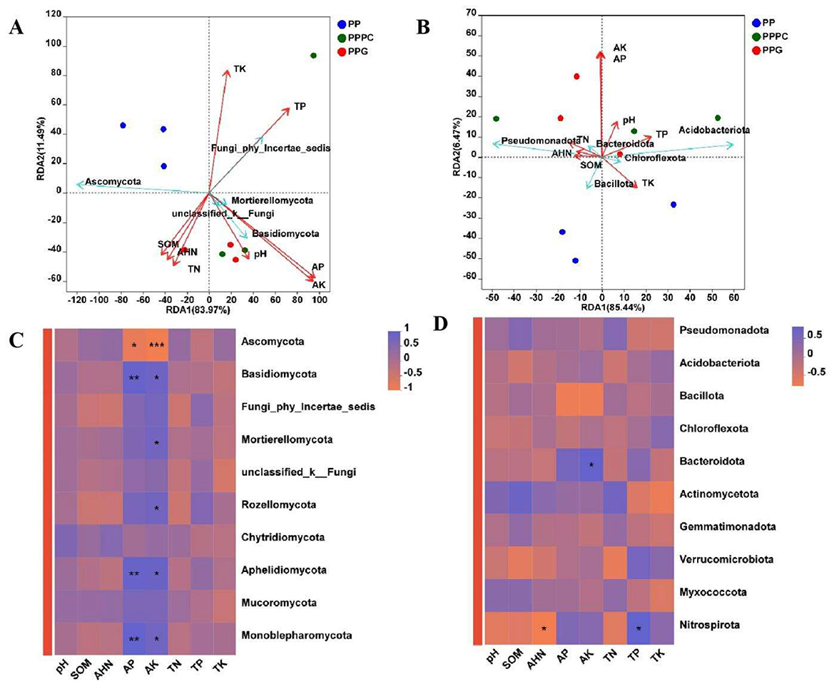 Figure 6. Analysis of the relationship between soil microbial community composition and soil physical and chemical characteristics. (A, C): Fungal phylum level; (B, D): Bacterial phylum level. PP, Monoculture of P. polyphylla; PPPC, Intercropping of P. cyrtonema and P. polyphylla; PPG, Intercropping of P. polyphylla and G. lucidum; SOM, Organic matter; AHN: Alkali-hydrolyzable nitrogen; AP, Available phosphorus; AK, Available potassium; TN, Total nitrogen; TP, Total phosphorus; TK, Total potassium. * indicates a significant difference between the two groups (*P < 0.05; **P < 0.01; ***P < 0.001).