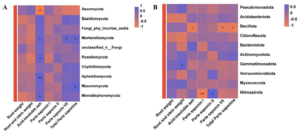 Figure 7. Correlation between the active components of P. polyphylla and the dominant soil microorganism phyla. (A) Components of P. polyphylla and dominant fungal phyla; (B) Components of P. polyphylla and dominant bacterial phyla. * indicates a significant difference between the two groups (*P < 0.05; **P < 0.01.