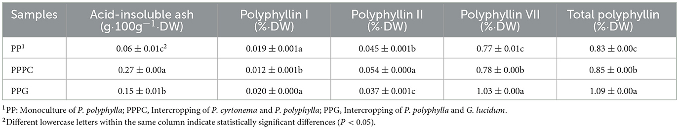 Significant differences were observed in the acid-insoluble ash content and the concentrations of active compounds in P. polyphylla across the all three cultivation treatments (Table 2). The acid-insoluble ash content reached its maximum in the PPPC treatment, measuring 0.27 g/100 g, which was significantly greater than the levels recorded in the PPG and PP treatments (P < 0.05), representing a 350.00% increase relative to the PP monoculture. Additionally, the concentration of polyphyllin I was significantly higher in the PPG treatment compared to PPPC, although no significant difference was detected between PPG and PP (Table 2). The highest concentration of polyphyllin II (0.05%) was observed in the PPPC treatment, corresponding to a 20.00% increase compared to the PP monoculture (P < 0.05). Polyphyllin VII and total polyphyllin contents were greatest in the PPG treatment, at 1.03% and 1.09%, respectively, which were significantly higher than those in PPPC and PP (P < 0.05), reflecting increases of 34.16% and 30.60% relative to the PP monoculture (P < 0.05). Furthermore, the levels of polyphyllin VII and total polyphyllin in PPPC were significantly elevated compared to PP (P < 0.05), with increases of 1.6% and 1.7%, respectively. These results indicate that intercropping P. polyphylla with G. lucidum and P. cyrtonema notably enhances the accumulation of active constituents in P. polyphylla