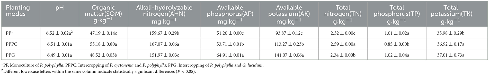 Table 3. Physical and chemical properties of rhizosphere soil of P. polyphylla under different intercropping modes.