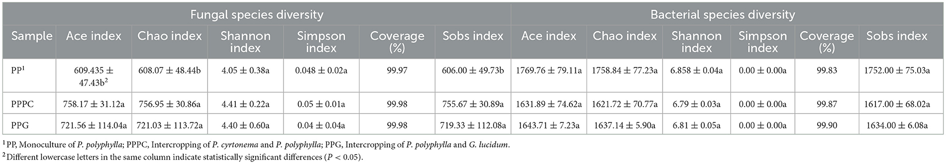 Table 4. Alpha diversity indices of fungal and bacterial communities in rhizosphere soil of P. polyphylla under different intercropping modes.