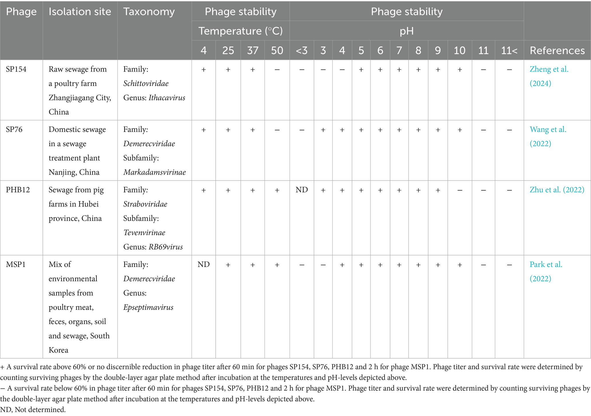 For a phage cocktail to be efficient, the individual phages must survive the physiological conditions during applications, such as adverse temperatures and pH. Temperature is relevant for applications, storage, and production of phage cocktails. For example, a two-phage cocktail survived pelleting used in feed production, showing that phages may be administered to feed for prophylactic use, like vitamins are today (Thanki et al., 2022). Phage titers were stable in feed at 4 °C, whereas they reduced over time in feed at barn temperatures (10 and 25 °C) and −20 °C (Thanki et al., 2022). For therapeutic application in cattle, phages should be stable at the animal body temperature of 38 to 40.5 °C (Terra and Reynolds, 2020). Among the Salmonella Dublin phages characterized in literature, all except MSP1, for which no data are available on stability at 4 °C, are stable between 4 °C and 37 °C, indicating good prospects for use in cattle (Table 1). Two phages are stable at 50 °C, while the remaining exhibit a decline in viability at this temperature. Depending on the application, the pH levels at different anatomical sites are also relevant for phage viability. The highest stability among the phages was at pH 5–8 (Zheng et al., 2024; Wang et al., 2022; Zhu et al., 2022; Park et al., 2022) (Table 1), which would enable it to survive in the bovine venous blood and rumen, represented by pH levels between 7.31–7.53 and 5.56–5.56, respectively (Herdt, 2020a; Herdt, 2020b). While the breadth of stability varies between phages, all the phages tested at a pH below 3 showed low viability, thus only causing challenges if the phages reach the abomasum, having a pH of 2 (Herdt, 2020a; Herdt, 2020b).