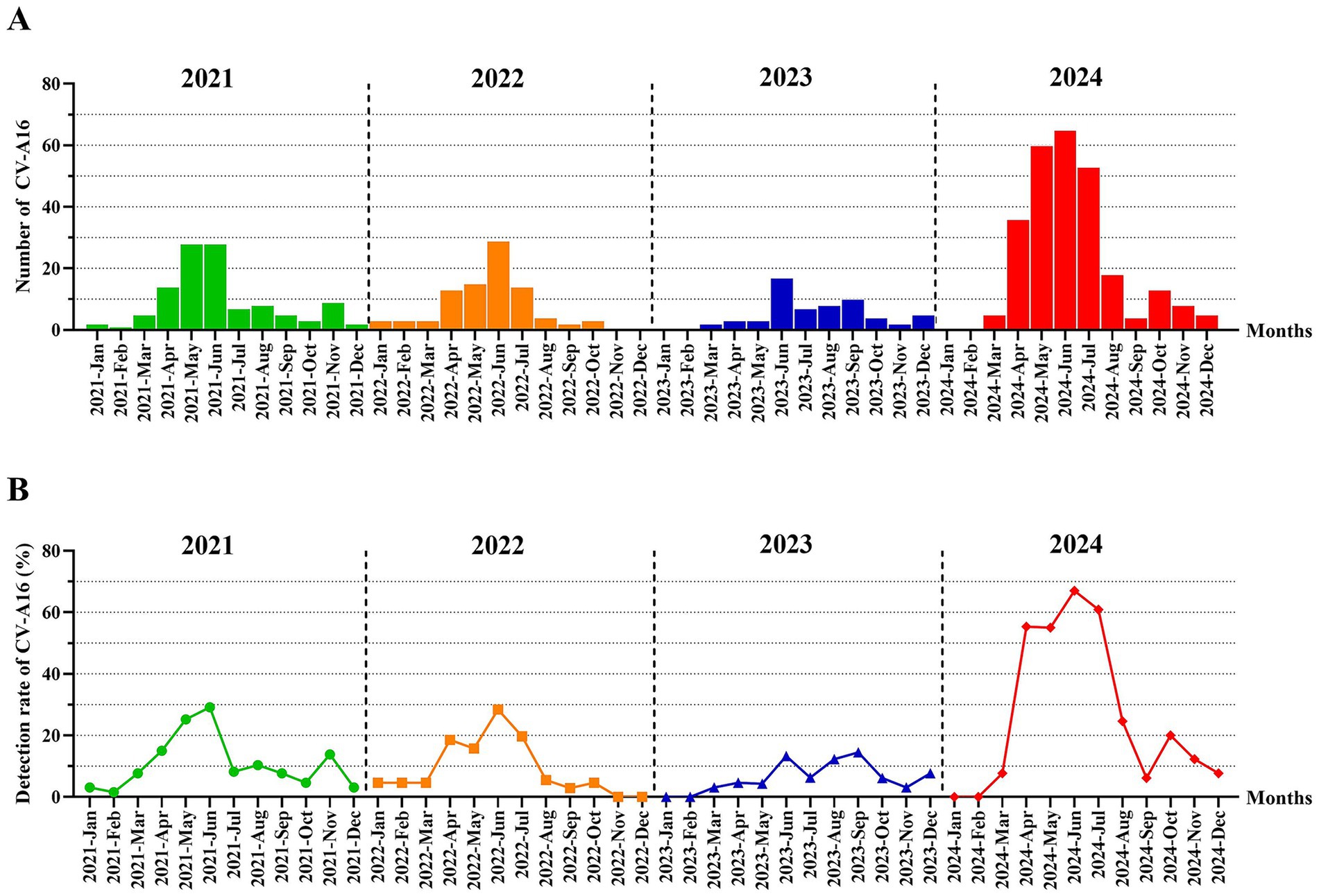 Figure 2. (A) The number distribution of laboratory-diagnosed CV-A16 cases in Hangzhou by month between 2021 and 2024. (B) The monthly detection rate distribution of CV-A16 cases confirmed by laboratories in Hangzhou during the period from 2021 to 2024.