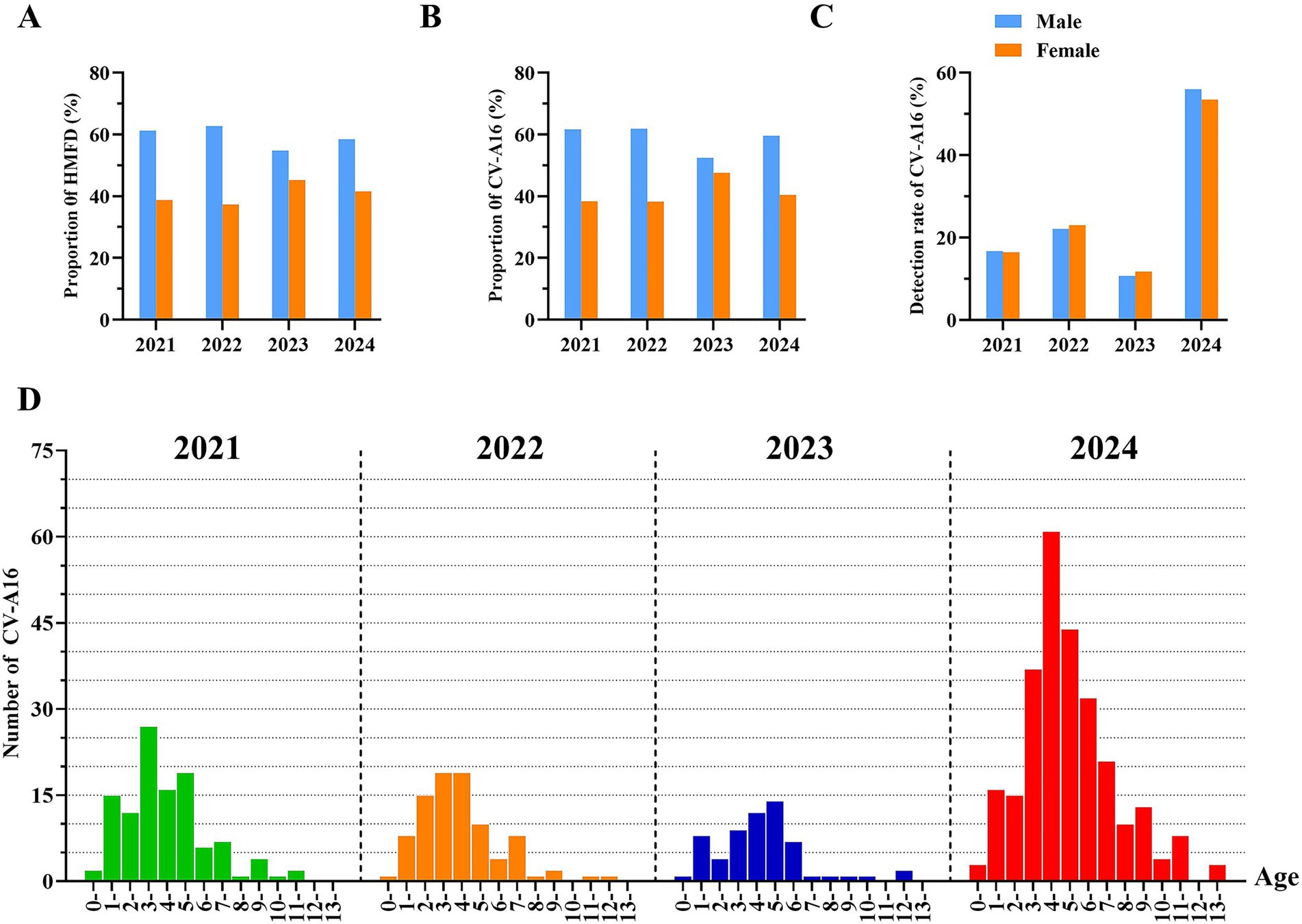 Figure 3. (A) The proportion of laboratory-diagnosed HFMD cases in Hangzhou between 2021 and 2024 by gender. (B) The proportion of laboratory-diagnosed CV-A16 cases between 2021 and 2024 by gender. (C) Detection rate of laboratory-diagnosed CV-A16 cases in Hangzhou between 2021 and 2024 by gender. (D) Age distribution of l laboratory-diagnosed CV-A16 cases in Hangzhou city, 2021–2024. Categorize the whole population into the following groups: 0–1, 1–2, 2–3, 3–4, 4–5, 5–6, 6–7, 7–8, 8–9, 10–11, 11–12, 12–13 and over 13 years old. The four colors represent different years, and the height of the bar graph represents the corresponding number of cases.
