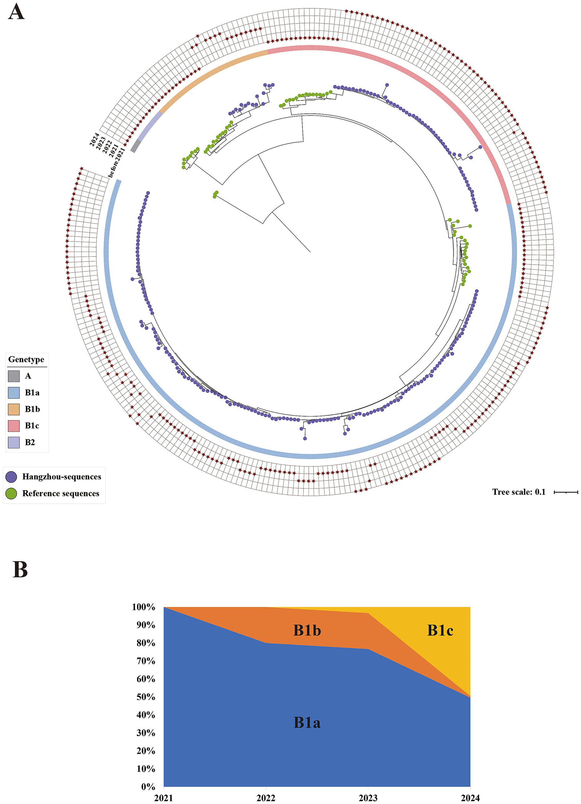 Figure 4. (A) Maximum likelihood tree constructed based on the 282 complete genome sequences of CV-A16 in Hangzhou from 2021 to 2024. The outer grid represents CV-A16 sequences from different years, with the grids from the inside out representing the years 2021, 2022, 2023, and 2024, and marked with asterisks. The inner circle represents different gene clusters/sub-gene clusters, labeled with different colors. The ends of each leaf are represented by circles of different colors for the reference sequences and the sequences from Hangzhou. The green circles represent the references sequence, and the purple circles represent the Hangzhou sequences. (B) The temporal distribution of CVA16 subgenotypes (B1a, B1b and B1c) in Hangzhou 2021–2024.
