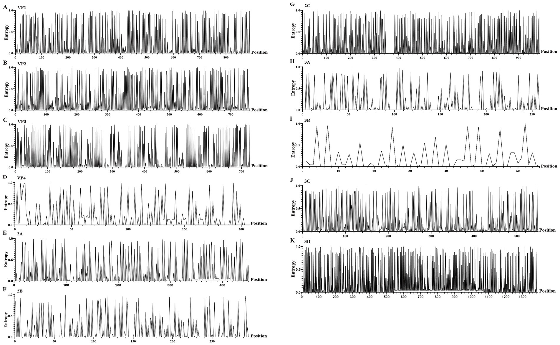 Figure 5. The entropy value of nucleotide sites for different gene segments of CV-A16. (A–K) represent the diagrams of entropy of the nucleic acid sites of the VP1, VP2, VP3, VP4, 2A, 2B, 2C, 3A, 3B, 3C and 3D, respectively.