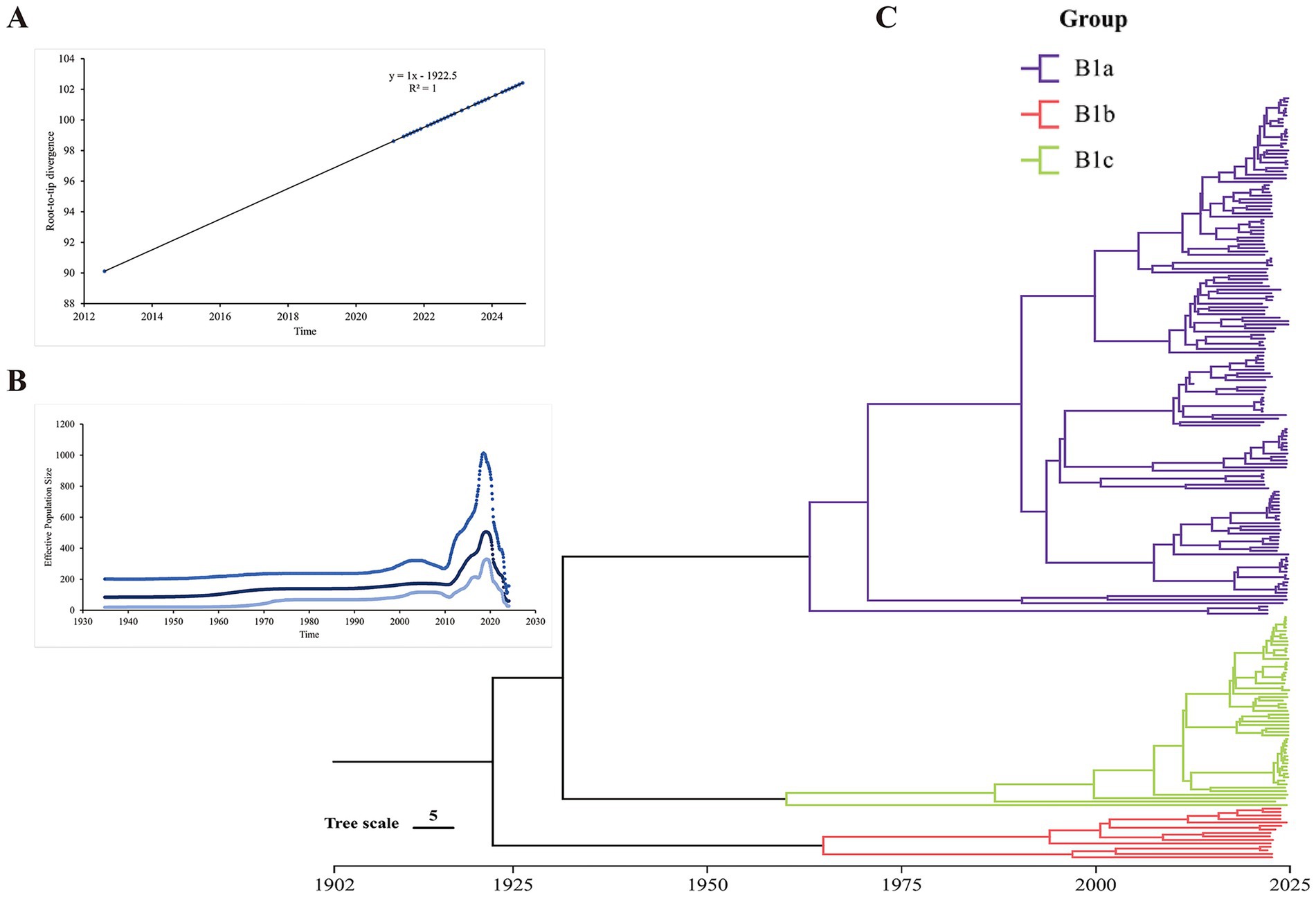 Figure 6. Molecular clock for evolutionary analysis of CV-A16 genotype B1 based on the whole genome sequence. (A) Evolutionary time signal through root-to-tip divergence analysis. (B) Population history of CV-A16 genotype B1 inferred by Bayesian skyline model. The x-axis represents the time scale in years, and the y-axis represents the effective population size. (C) Bayesian Maximum Evolutionary Branch Confidence (MCC) phylogenetic tree.