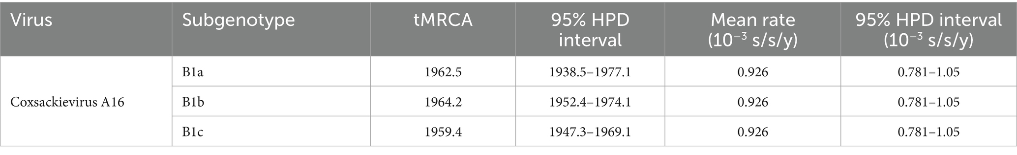 Table 2. The mean time of the most recent common ancestor (tMRCA), 95% highest probability density (HPD) and estimated the mean substitution rate of Hangzhou CVA16.