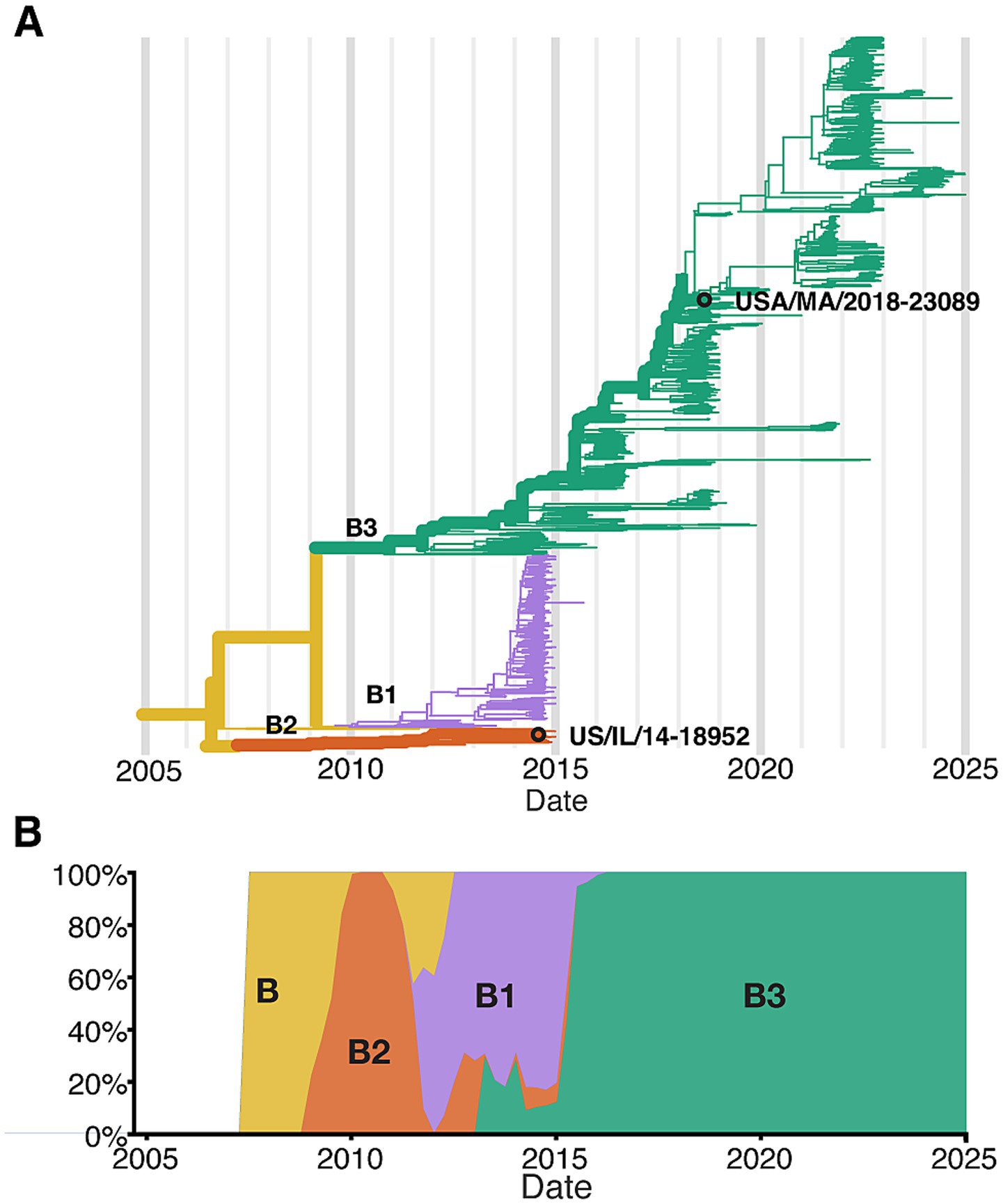 Panel A shows a phylogenetic tree of viral sequences from 2005 to 2025, illustrating evolutionary relationships with clades B2, B1, and B3 labeled. Notable samples are marked, such as