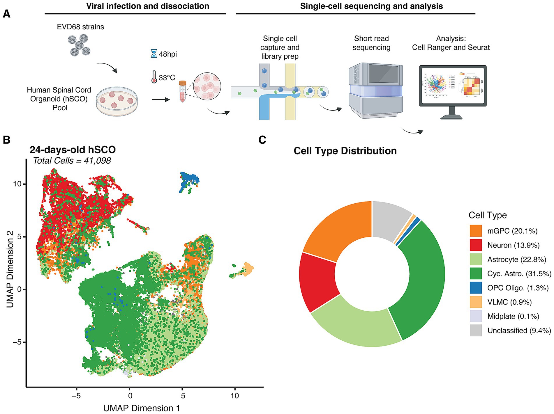 Diagram depicting viral infection, dissociation, and single-cell sequencing of human spinal cord organoids. Panel A shows the experimental workflow, including infection with EVD68, incubation, and sequencing. Panel B presents a UMAP plot of cell populations in a 24-day-old organoid, highlighting different cell types. Panel C is a doughnut chart showing the distribution of cell types, with key percentages of mGPC, neurons, astrocytes, and other classifications.