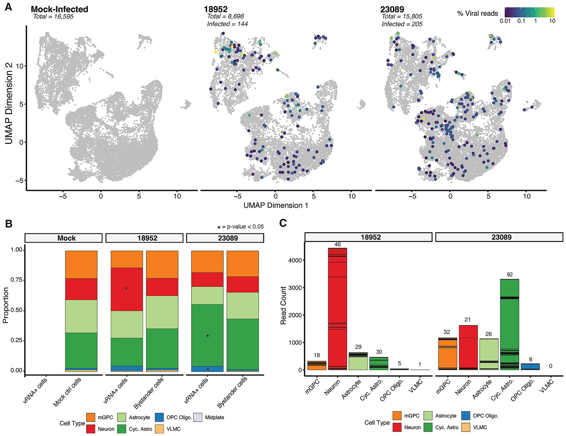 Panel A displays UMAP plots comparing mock-infected and infected samples (18952, 23089), illustrating viral read percentages with color coding. Panels B and C present proportional and read count bar charts for cell types, differentiated by color, showing statistical significance with asterisks.