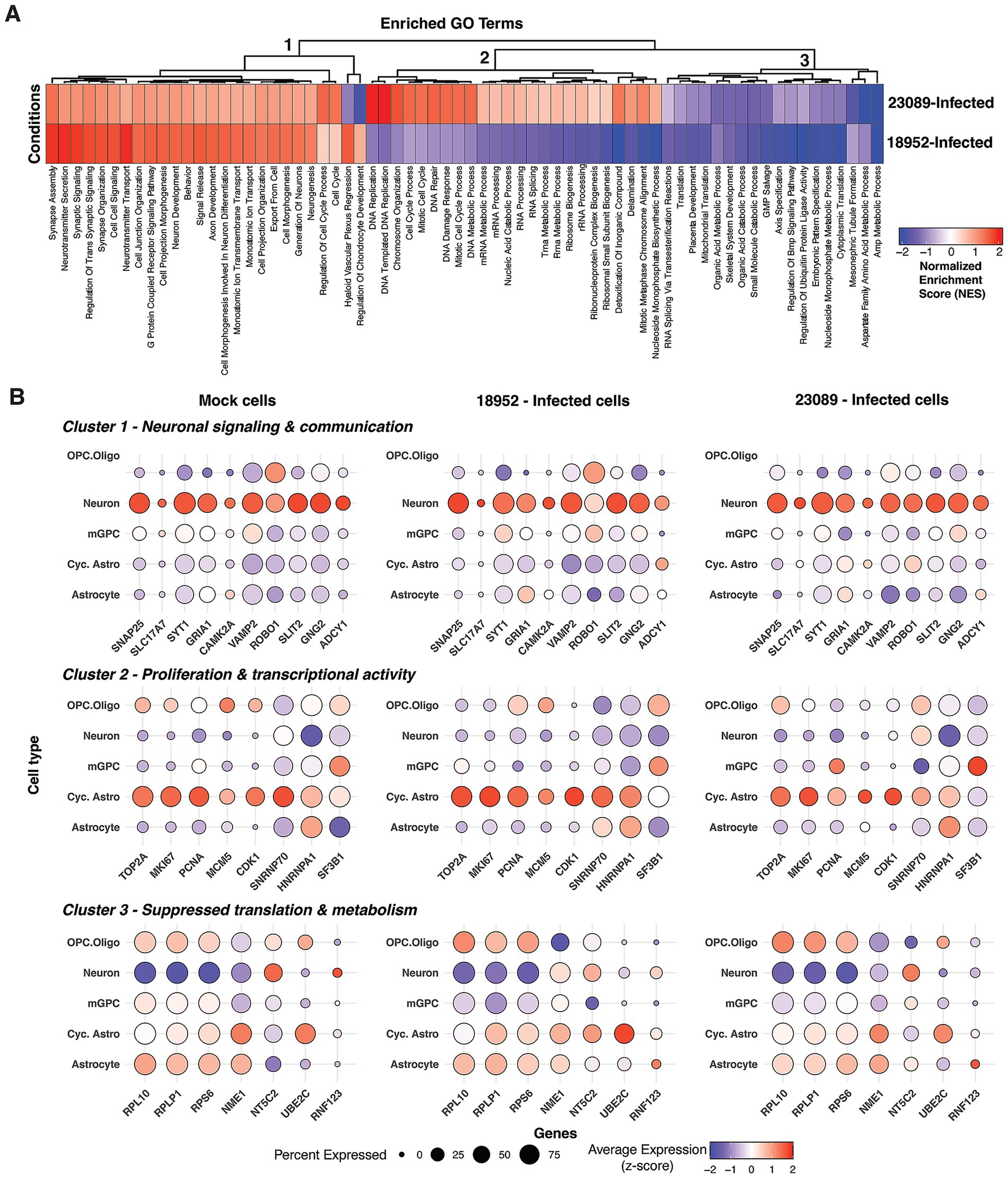 Diagram depicting gene expression analysis. Panel A shows a heatmap of enriched Gene Ontology (GO) terms for 18952-infected and 23089-infected conditions, with colors ranging from red to blue indicating normalized enrichment scores. Panel B consists of three clusters for mock and infected cells: neuronal signaling and communication, proliferation and transcriptional activity, and suppressed translation and metabolism. Each cluster displays bubble plots indicating percent expression and average expression z-score for various genes across different cell types: OPC.Oligo, Neuron, mGPC, Cyc. Astro, and Astrocyte.