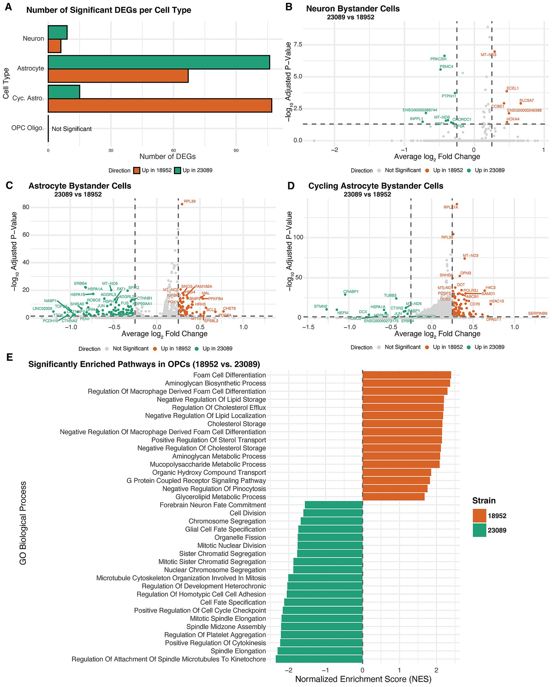 Bar charts and volcano plots depict gene expression analysis across different cell types, highlighting significant differentially expressed genes (DEGs). Panel A shows the number of significant DEGs per cell type, with distinctions between upregulated genes in two strains, 18952 and 23089. Panels B, C, and D present volcano plots for neuron, astrocyte, and cycling astrocyte bystander cells, indicating fold change and p-value. Panel E displays significantly enriched pathways in oligodendrocyte precursor cells (OPCs), with pathways categorized by normalized enrichment scores for the two strains.