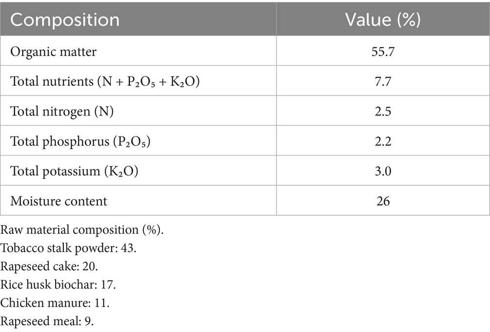 The experiment adopted a randomized block design with 4 treatments at each location, replicated 3 times. Each treatment replication plot constituted one experimental unit, with each plot covering approximately 50 m2. The specific fertilization treatments were: no organic nitrogen application (CK), 40% organic nitrogen substitution (40% ON), 50% organic nitrogen substitution (50% ON), and 60% organic nitrogen substitution (60% ON). Total nitrogen application was equivalent across all treatments at 154 kg·ha−1, while phosphorus and potassium fertilizers were applied according to local standard fertilization practices (P₂O₅: 126 kg·ha−1, K₂O: 488 kg·ha−1). Commercial organic fertilizer was used as the organic nitrogen source (detailed composition shown in Table 1). The tobacco variety tested was “K326.”