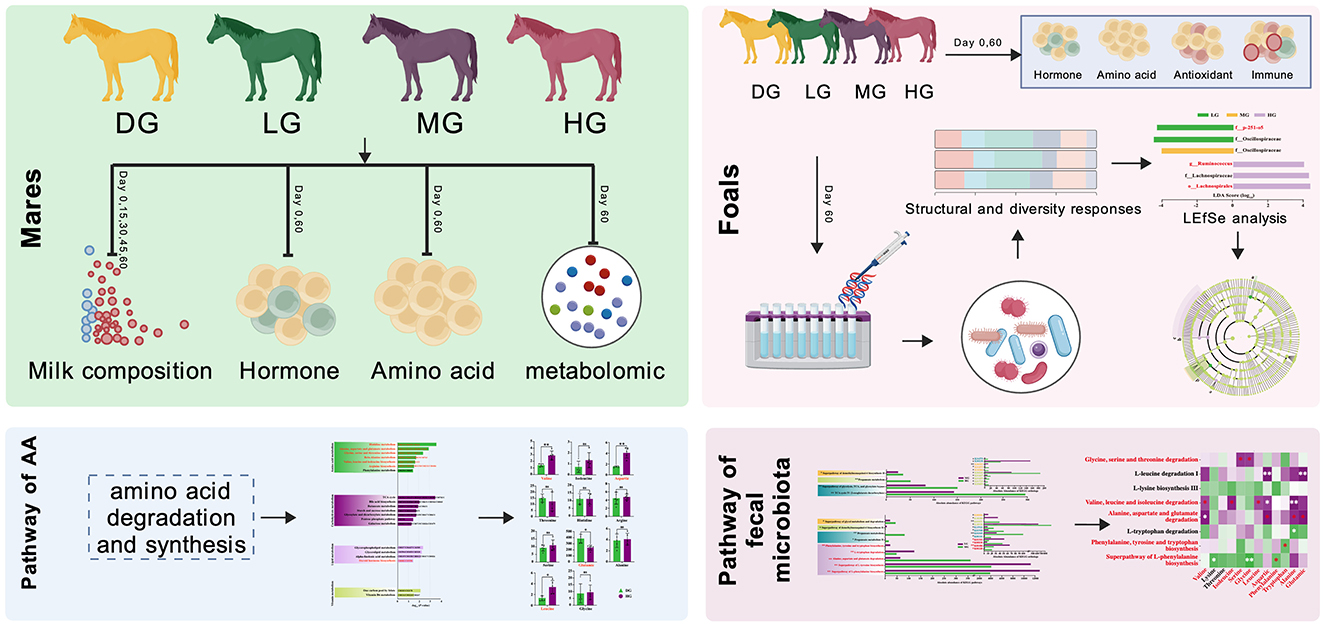 The experiment was carried out at Zhaosu Horse Farm, Yili Kazakh Autonomous Prefecture, Xinjiang, China. Twenty lactating Yili mares and their suckling foals (2 ~ 3 months of age) were enrolled. The initial body weights were 97.60 ± 13.24 kg for foals and 392.90 ± 12.18 kg for mares. Foals were randomly assigned to four groups (n = 5 per group): control (DG), low-dose (LG), medium-dose (MG), and high-dose (HG). Mares were grouped together with their respective foals (Figure 1).