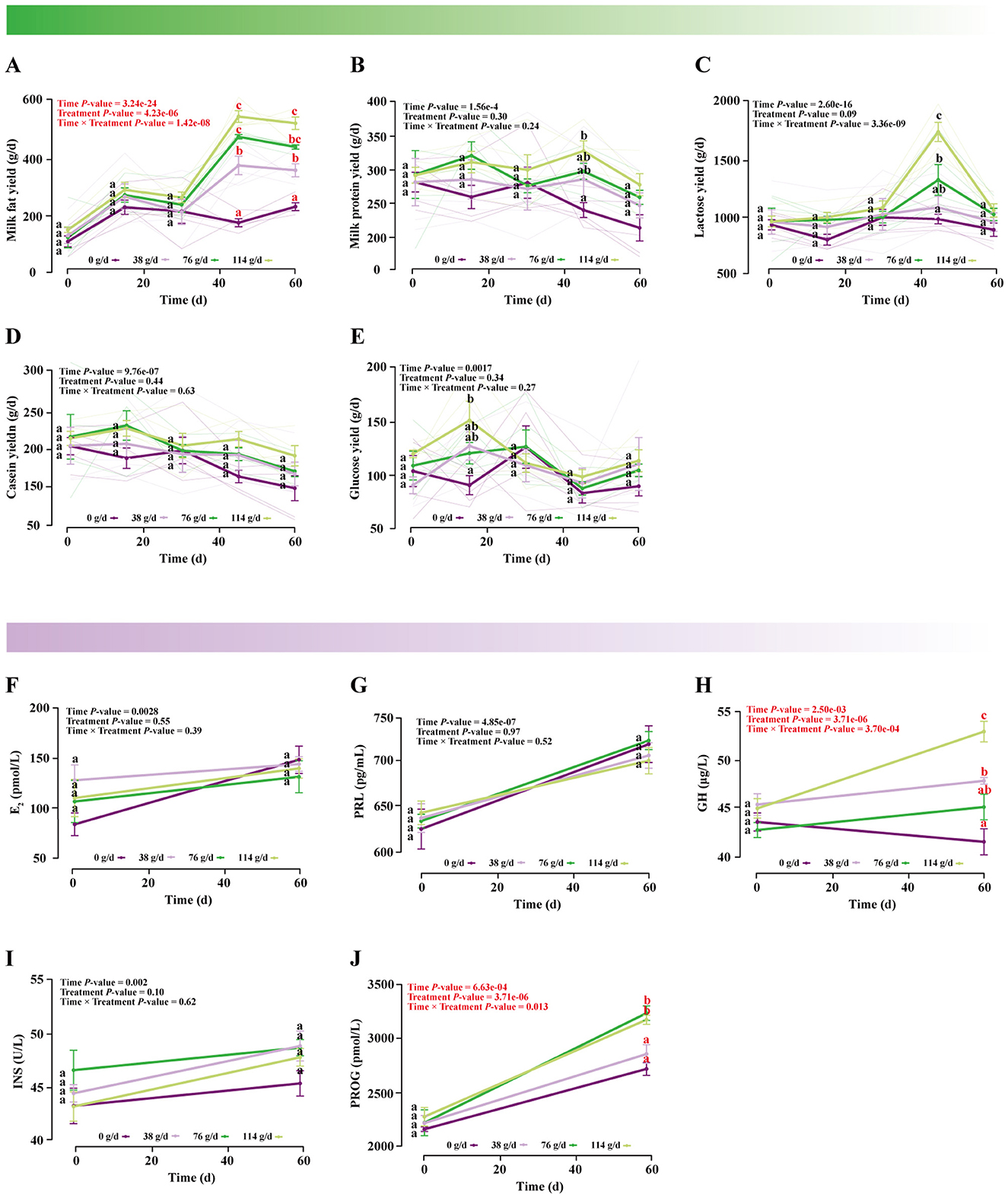 Figure 2. Effects of dietary supplementation with different doses of BCAAs on lactation performance indicators. A linear mixed model was used to analyze the interaction effect between BCAA treatment (Treatment) and time (Time). (A) Milk fat yield, (B) milk protein yield, (C) lactose yield, (D) casein yield, (E) glucose yield, (F) E2 concentration in mare milk, (G) PRL concentration in mare milk, (H) GH concentration in mare milk, (I) INS concentration in mare milk, (J) PROG concentration in mare milk. Data were compared using Tukey's HSD test. Values marked with the same letter are not significantly different (P > 0.05). Different lowercase letters indicate a significant difference (P < 0.05), and different uppercase letters indicate a highly significant difference (P < 0.01).