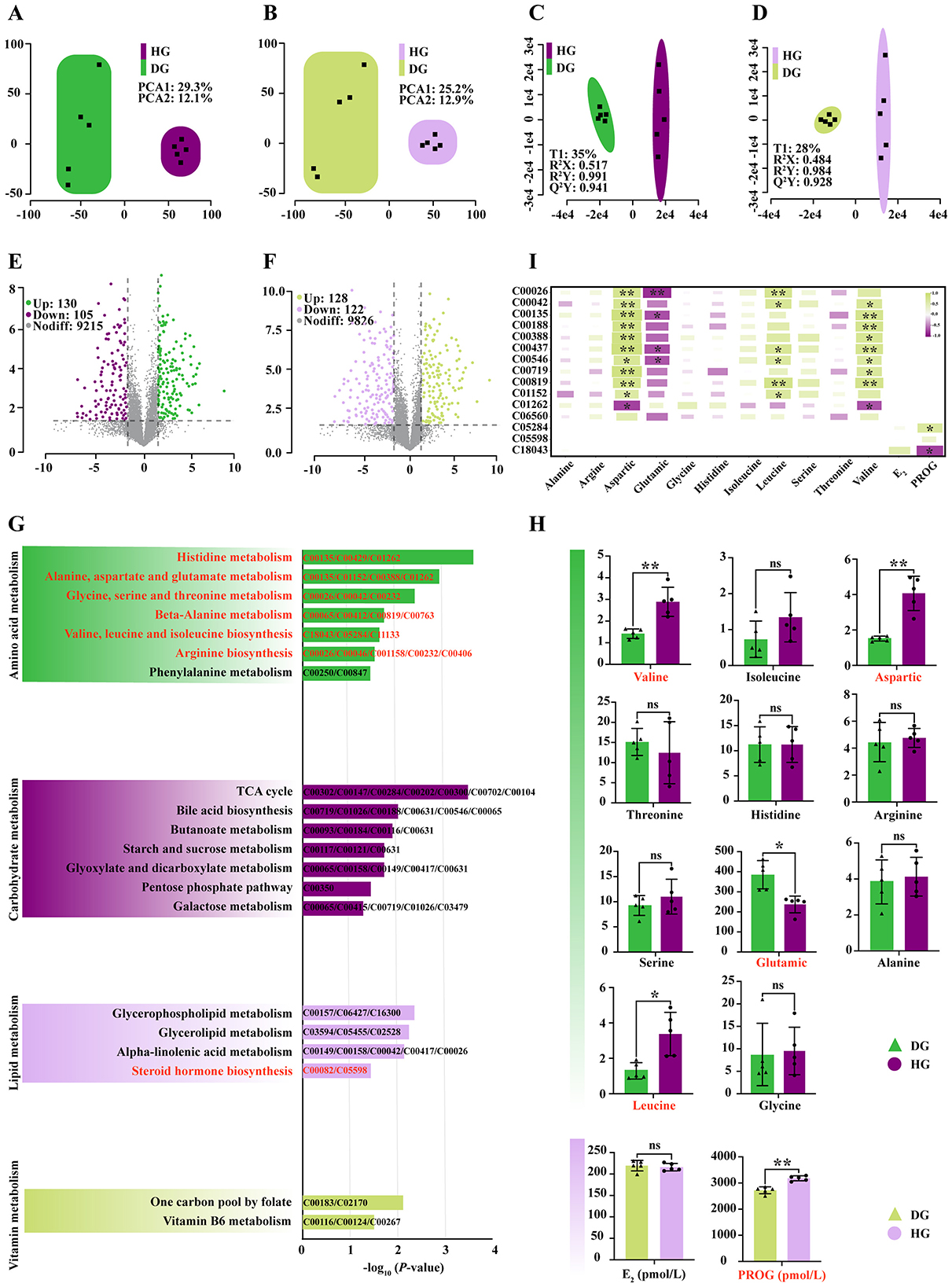 Using the criteria P < 0.05 and VIP > 1, 235 differentially expressed metabolites (DEMs) were identified in positive ion mode (130 upregulated, 105 downregulated; Figure 3E) and 250 DEMs in negative ion mode (128 upregulated, 122 downregulated; Figure 3F). Enrichment analysis indicated that BCAAs supplementation predominantly altered organic acids and derivatives (Figure 3G and Supplementary Table S3), thereby modulating amino acid, carbohydrate, lipid, and vitamin metabolism. Specifically, high-dose supplementation significantly affected three BCAAs (Val, Leu, Ile) and six free amino acids (His, Thr, Phe, Ala, Asp, Glu, Gly, Ser) in mare milk (Figure 3G). Among these, Leu (P < 0.05) and Val (P < 0.01) were significantly increased. For non-essential amino acids, Asp was elevated (P < 0.05), whereas Glu decreased (P < 0.05; Figure 3H). Altered metabolite abundance further impacted steroid hormone synthesis: PROG was significantly increased in the HG group (P < 0.01), whereas E2 showed no significant change (P > 0.05; Figure 3H).
