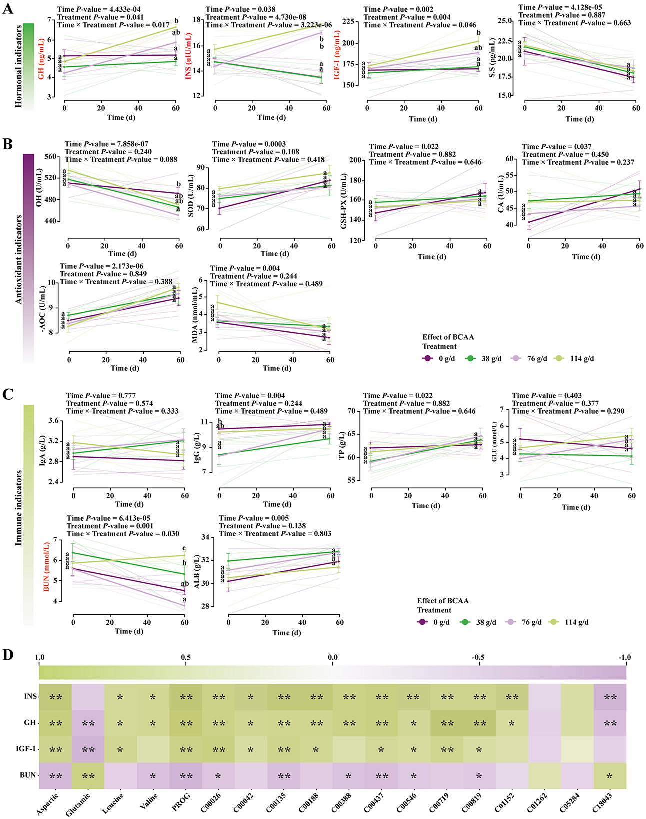 Figure 4. Effects of consuming milk with different doses of BCAAs on serum hormone levels, immune indices, and antioxidant parameters in foals. (A) Hormone levels, (B) antioxidant parameters, (C) immune indices. A linear mixed model was used to analyze the interaction effect between Treatment and Time. Group comparisons were performed using Tukey's HSD test. Values sharing the same superscript letter are not significantly different (P > 0.05). Different lowercase letters indicate a significant difference (P < 0.05), and different uppercase letters indicate a highly significant difference (P < 0.01). (D) Pearson correlation heatmap between significantly altered parameters in foals and the corresponding indicators in mare milk. nsP > 0.05; *P < 0.05; **P < 0.01.