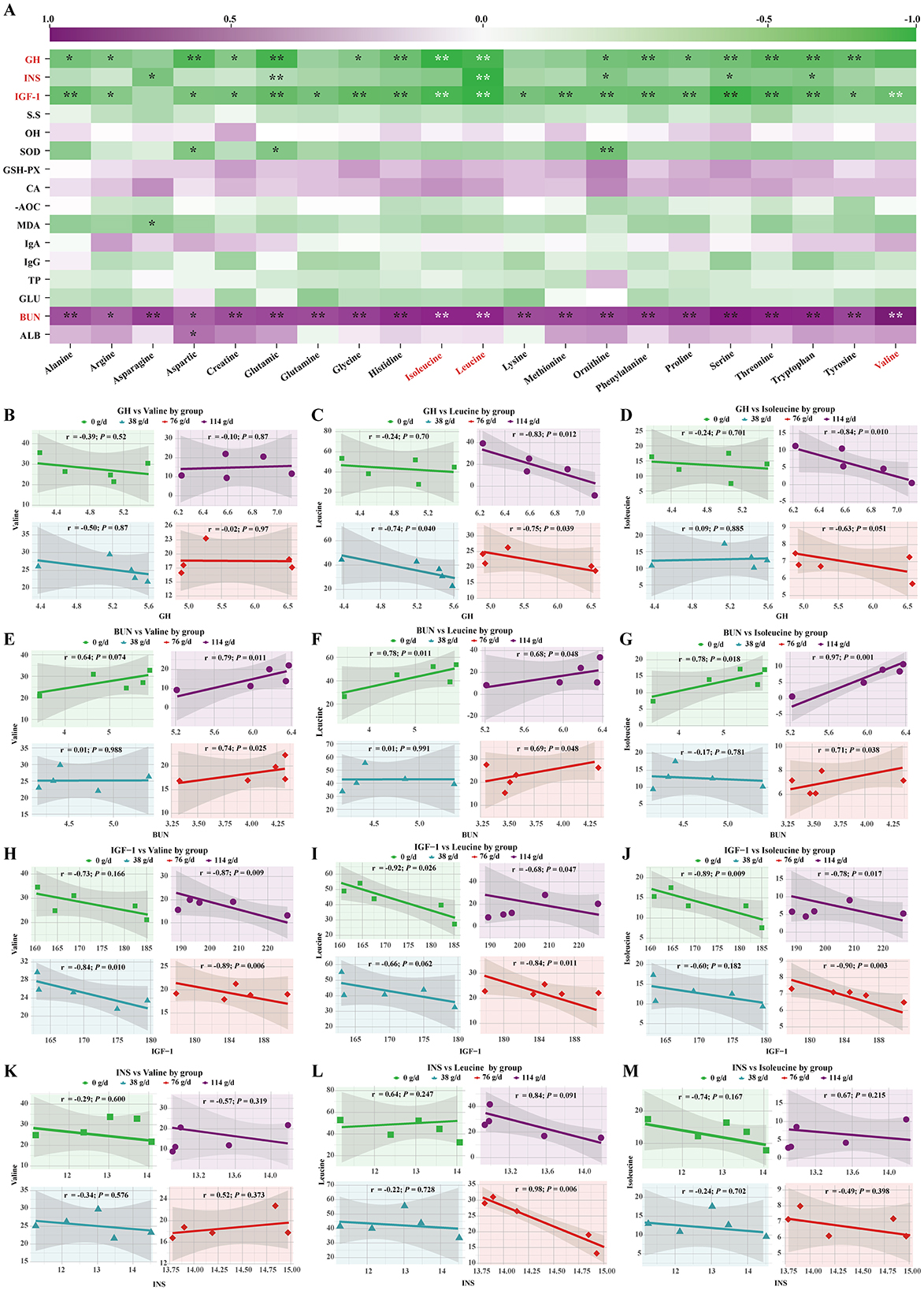 Figure 5. Correlation analysis between significantly altered parameters and serum AAs in foals. (A) Heatmap of Pearson correlation coefficients between all measured parameters and amino acids. (B–D) Scatter plots of the correlation between serum GH and BCAAs in each dose group. (E–G) Scatter plots of the correlation between blood BUN and BCAAs in each dose group. (H–J) Scatter plots of the correlation between IGF-1 and BCAAs in each dose group. (K–M) Scatter plots of the correlation between INS and BCAAs in each dose group.