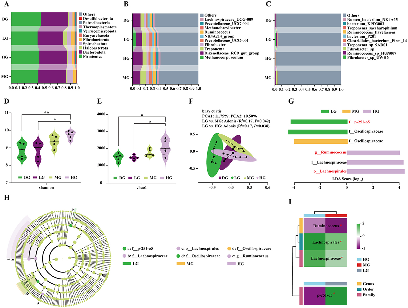 LEfSe analysis (LDA score > 3.5) identified six differentially enriched taxa (Figures 6G, H). No significant biomarkers were detected in DG. LG was characterized by f_p-251-o5 and f_Oscillospiraceae; MG by f_Oscillospiraceae; and HG by g_Ruminococcus, o_Lachnospirales, and f_Lachnospiraceae. The relative abundances of g_Ruminococcus, o_Lachnospirales, and f_Lachnospiraceae were significantly higher in HG than MG (Figure 6H), while f_p-251-o5 was significantly lower in HG than LG (Figure 6I).