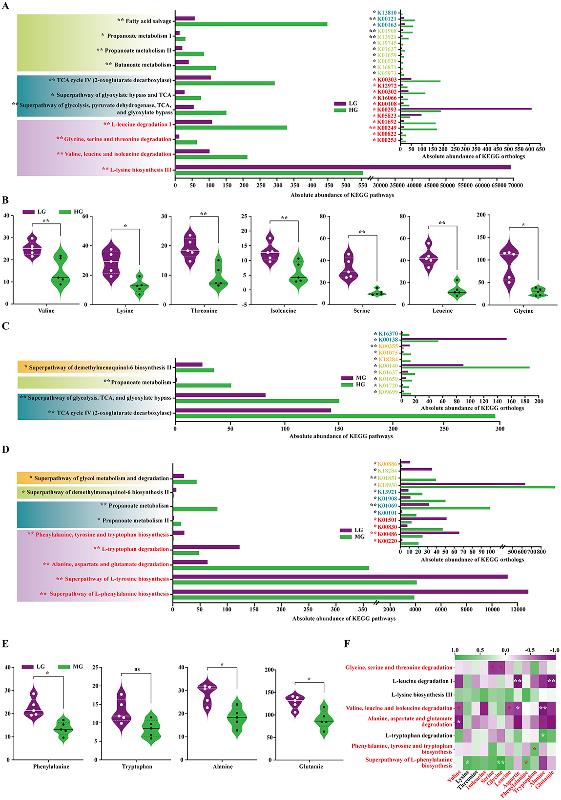 Figure 7. KEGG functional prediction of the foal gut microbiota based on PICRUSt2. (A) Differences in KEGG pathway and Ortholog abundance between the HG and LG groups. (B) Differences in abundance of relevant amino acids in pathways between the HG and LG groups. (C) Differences in KEGG pathway and Ortholog abundance between the HG and MG groups. (D) Differences in KEGG pathway and Ortholog abundance between the MG and LG groups. (E) Differences in abundance of relevant amino acids in pathways between the MG and LG groups. (F) Heatmap of Pearson correlations between significantly different pathways and foal serum amino acid content. All between-group comparisons were performed using Student's t-test. Significance levels: nsP > 0.05; *P < 0.05; **P < 0.01.