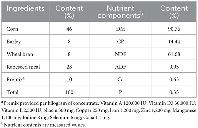 All groups were managed under identical conditions for 67 days, including a 7-day adaptation period followed by a 60-day feeding trial. During the trial, each mare was provided with 2 kg of concentrate feed daily (ingredient composition shown in Table 1). In addition, mares in the treatment groups received a BCAA mixture (Ile:Leu:Val = 1:2:1.2; Xinjiang Lianying Biotechnology Co., Ltd.) at the following doses: DG, 0 g/d; LG, 38 g/d; MG, 76 g/d; and HG, 114 g/d.