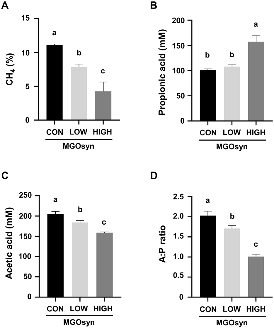 Figure 1. Effects of MGOsyn supplementation on rumen fermentation characteristics. (A) Percentage of methane (CH4) in the total gas produced after 24 h of in vitro fermentation with MGOsyn supplementation. (B) Concentration of propionic acid (mM), a key volatile fatty acid associated with energy efficiency and hydrogen utilization. (C) Concentration of acetic acid (mM), the most abundant volatile fatty acid produced during rumen fermentation. (D) Ratio of acetic acid to propionic acid (A:P ratio), an important indicator of rumen fermentation pattern shifts. Bars with different superscript letters indicate statistically significant differences among treatment groups (P < 0.05).