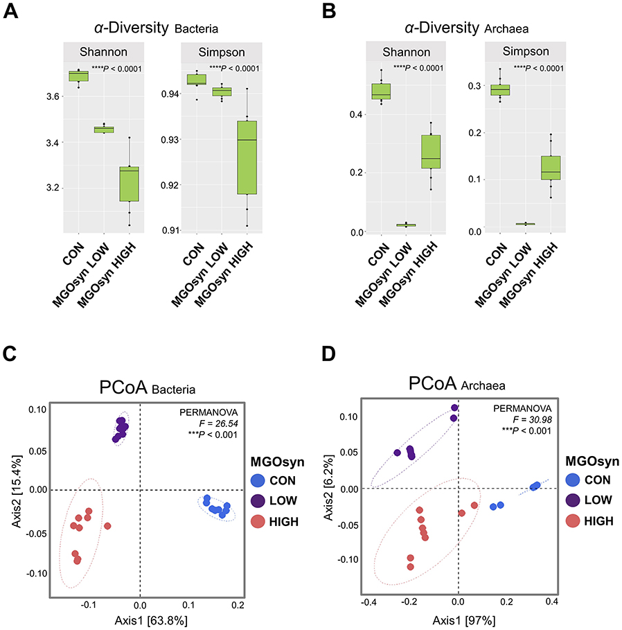 Box plots and PCoA plots illustrate the alpha-diversity and beta-diversity of microbial communities in response to MGOsyn supplementation. Panel A shows alpha-diversity indices (Shannon and Simpson) of bacterial communities under CON, MGOsyn LOW, and MGOsyn HIGH treatments, showing significant differences. Panel B shows alpha-diversity indices of archaeal communities under the same treatments, also showing significant differences. Panel C shows a PCoA plot of bacterial communities at the genus level based on Bray–Curtis dissimilarity, with MGOsyn supplemented groups clustering separately from the control, indicating distinct community structures. Panel D shows a PCoA plot of archaeal communities with similar clustering patterns.