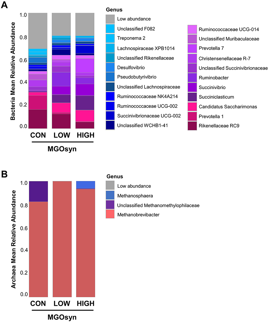Bar plots illustrate the mean relative abundances of microbial taxa at the genus level across CON, MGOsyn LOW, and MGOsyn HIGH treatments. Panel A shows the bacterial community composition, with mean relative abundances of dominant genera displayed for each group. Genera with relative abundances below 1% are grouped as “Low abundance” for clarity, highlighting shifts in microbial profiles associated with MGOsyn supplementation. Panel B shows the archaeal community composition, with mean relative abundances of archaeal genera, illustrating changes in methanogenic populations in response to MGOsyn. Each graph includes a legend showing which genera are represented by the different colors.