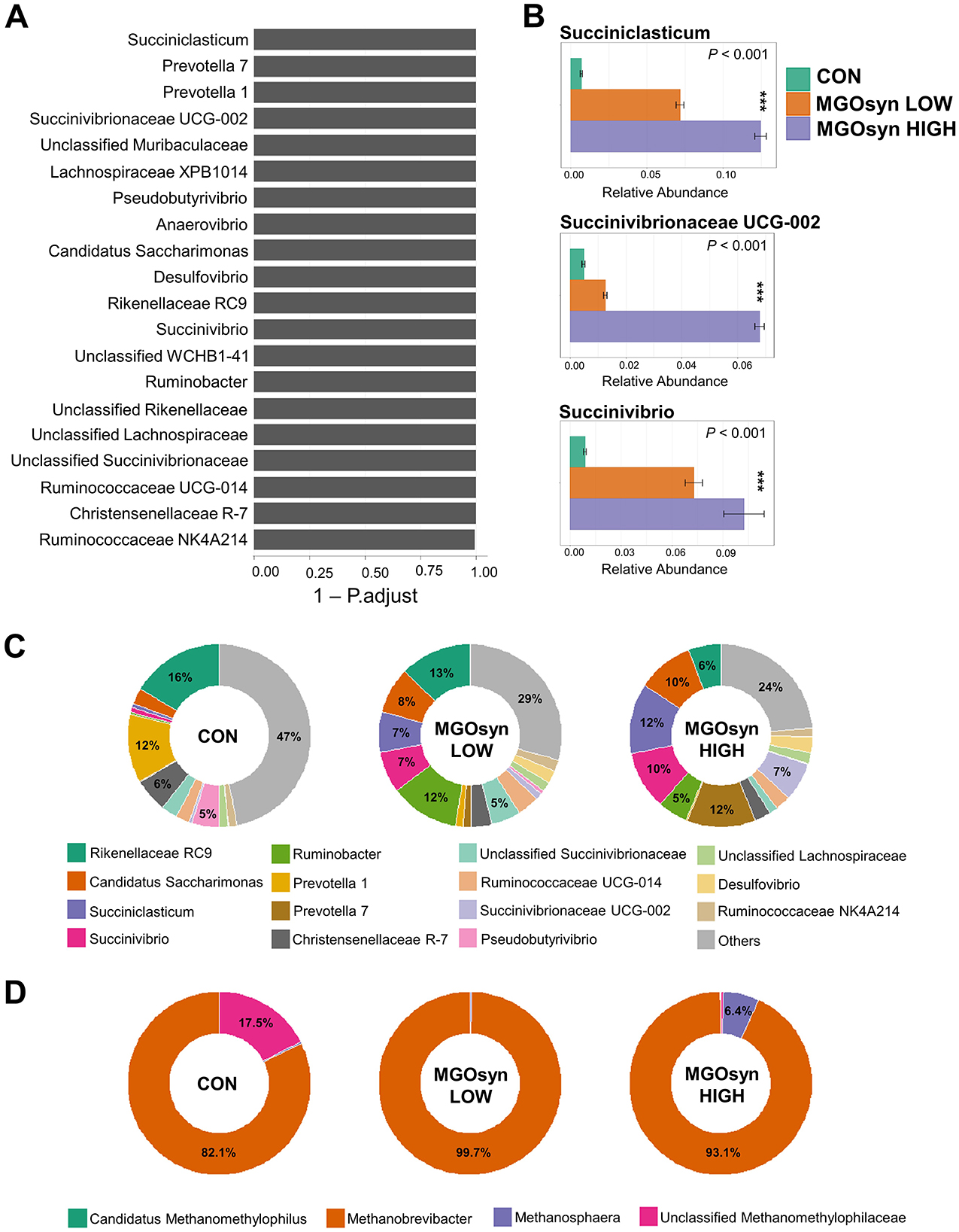 Figure 4. Effects of MGOsyn supplementation on bacterial and archaeal community composition. (A) Differentially abundant taxa among MGOsyn treatment groups identified using ALDEx2 analysis, based on centered log-ratio (CLR) transformed abundance data. Taxa with significant differences (adjusted P < 0.05) are shown, indicating key genera that responded to MGOsyn supplementation. (B) Relative abundances of representative taxa, including Succiniclasticum, Succinivibrionaceae UCG-002, and Succinivibrio. Statistical analysis was performed using the Kruskal–Wallis rank-sum test. ***P < 0.001. (C) Relative abundance of the top 15 bacterial genera presented as donut charts. The charts illustrate shifts in the bacterial community composition across the treatment groups (CON, MGOsyn LOW, and MGOsyn HIGH). (D) Relative abundance of the top four archaeal genera shown in donut charts. These charts depict changes in the methanogenic archaeal populations.