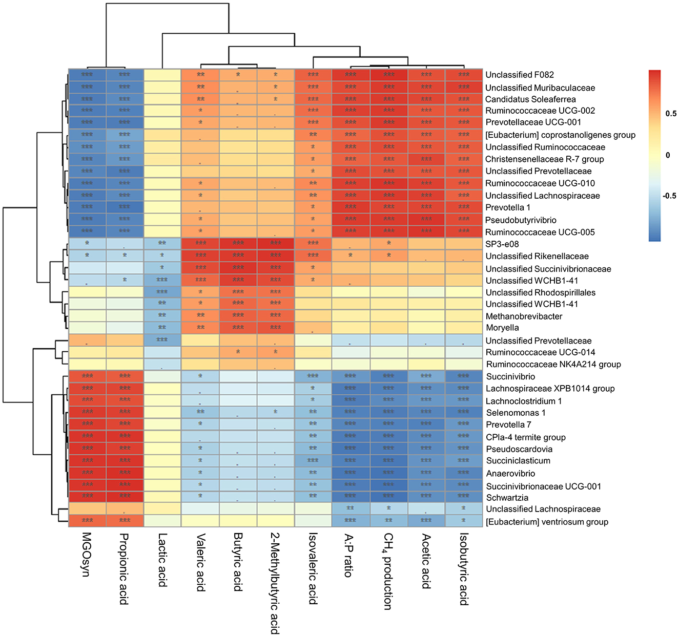 Figure 5. Correlations between bacterial genera and rumen fermentation parameters. Heatmap illustrating the Spearman correlation coefficients between the relative abundances of bacterial genera and key fermentation parameters: individual VFAs (acetic, propionic, butyric, isobutyric, 2-methylbutyric, valeric, and isovaleric acids), A:P ratio, CH4 production, and MGOsyn supplementation. Positive and negative correlations are shown in red and blue, respectively, with color intensity representing the strength of the correlation (r). Statistical significance: ***P < 0.001, **P < 0.01, *P < 0.05, P < 0.1.
