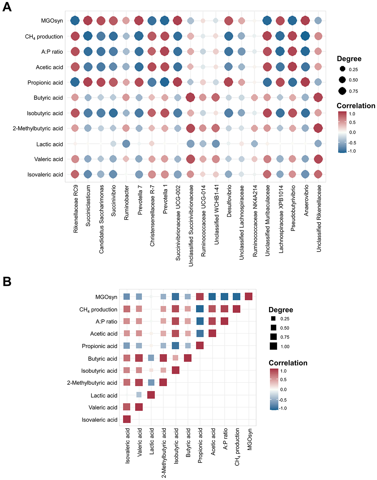 Correlation plots illustrate relationships between microbial genera and rumen fermentation parameters, as well as intercorrelations among the parameters. Panel A shows Spearman correlations between the relative abundances of the 20 most abundant bacterial genera and key fermentation parameters, including individual VFAs (acetic, propionic, butyric, isobutyric, 2-methylbutyric, valeric, isovaleric acids), acetate to propionate ratio, CH4 production, and MGOsyn supplementation. Panel B shows intercorrelations among major rumen fermentation parameters. Correlation coefficients range from -1 to 1, with positive correlations in red, negative in blue, and color intensity representing correlation strength.