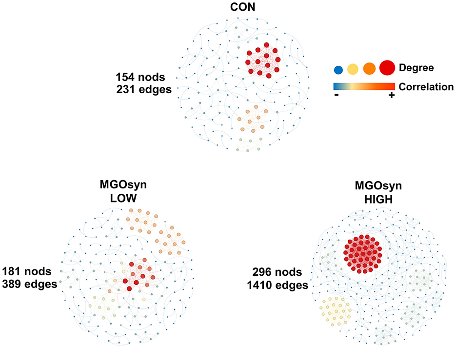 We conducted network analysis based on Spearman's rank correlation at the genus level to investigate microbial communities associated with MGOsyn supplementation (Figure 7). A stronger microbial network was observed with increasing doses. The MGOsyn LOW supplemented group exhibited 181 nodes and 389 edges, whereas the MGOsyn HIGH supplemented group showed a more complex network with 296 nodes and 1,410 edges. In contrast, the control group contained 154 nodes and 231 edges (Figure 7, Supplementary Tables S3S8).