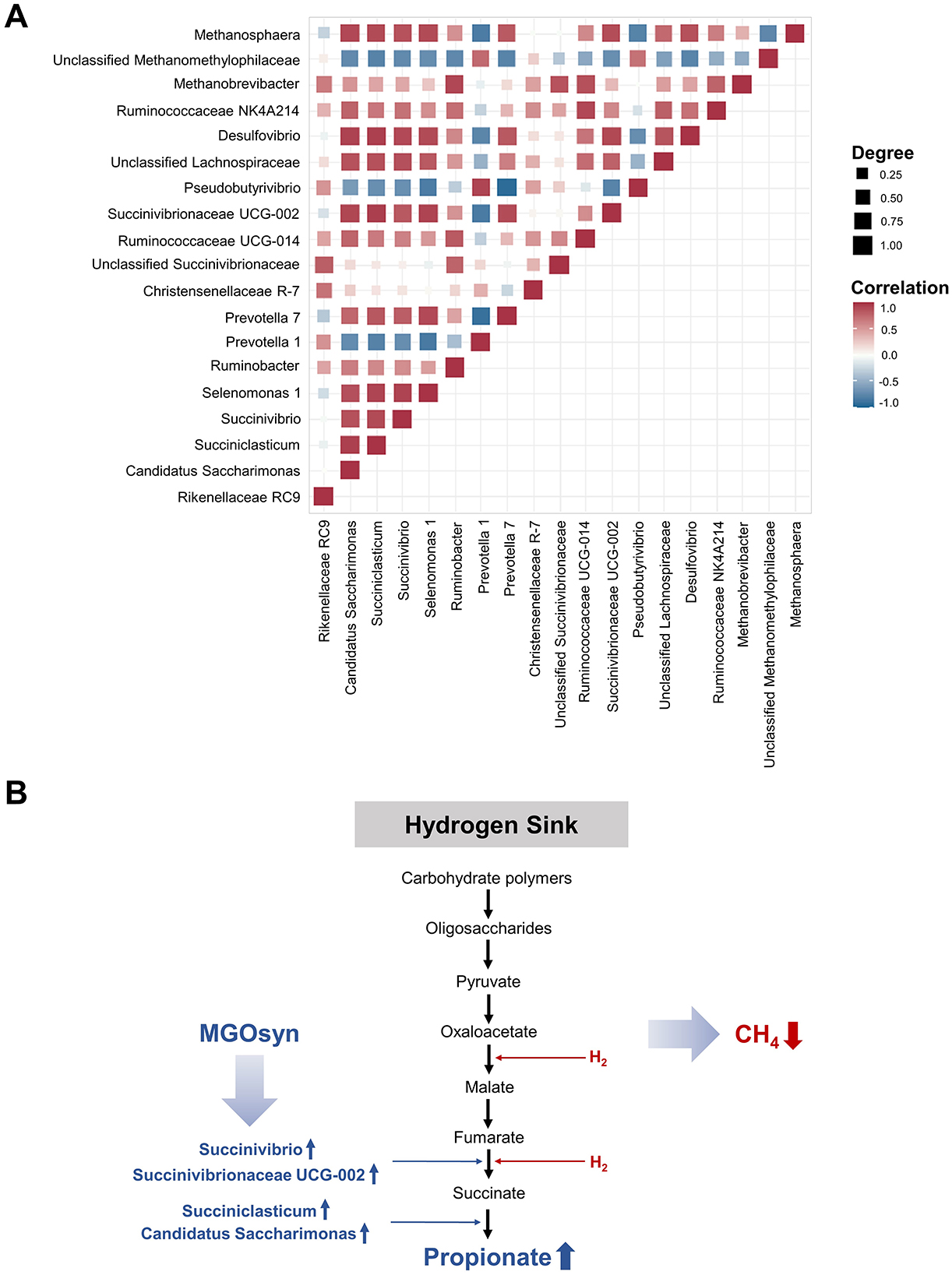 Graphs illustrate the mode of action of MGOsyn on rumen microbial communities and fermentation. Panel A shows a Spearman correlation matrix of 19 bacterial and archaeal genera associated with MGOsyn supplementation. Positive correlations (r = 1) are shown in red, indicating co-occurring taxa, while negative correlations (r = -1) are shown in blue, indicating inversely related taxa, illustrating potential microbial interactions and community dynamics. Panel B shows a schematic of MGOsyn’s predicted mode of action, enhancing hydrogen utilization by promoting propionate production, which reduces substrate availability for methanogenic archaea, leading to decreased CH4 emissions and improved fermentation efficiency. Key microbes involved include Succinivibrio, Succinivibrionaceae UCG-002, Succiniclasticum, and Candidatus Saccharimonas.