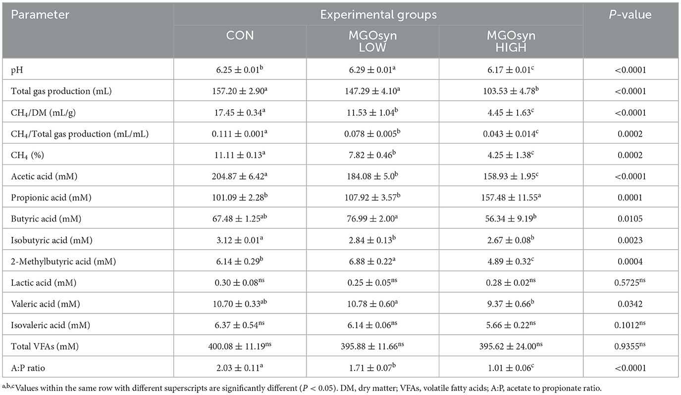 Functional predictions derived from microbial community analyses provide only potential insights into metabolic activities, as they are inferred from taxonomic composition and relative abundances rather than from direct measurements of functional processes. Consequently, such predictions serve as exploratory indications rather than definitive evidence of microbial function. In this study, we addressed these limitations by comparing predicted functions with actual measurements of VFAs metabolism, allowing a more accurate assessment of fermentation processes and a deeper understanding of MGOsyn's effects on rumen microbial activity. Nevertheless, we acknowledge the inherent limitations of in vitro systems, including the absence of host interactions and the potential for experimental artifacts. Based on these exploratory in vitro results, further in vivo studies are warranted to validate the findings and to comprehensively evaluate the efficacy of MGOsyn under physiological conditions.