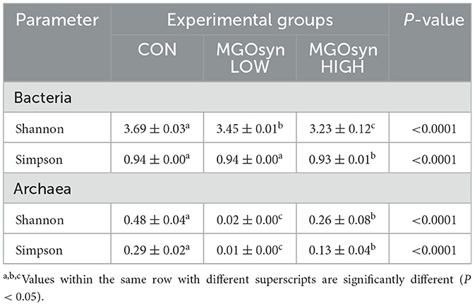 The α-diversity indices, including the Shannon (richness and evenness) and Simpson (dominance and evenness) indices of the archaeal community, were significantly influenced by MGOsyn supplementation (P < 0.0001; Figure 2B, Table 2). The β-diversity analysis at the genus level showed a clear divergence between MGOsyn supplemented and control samples. Similar to the bacterial communities, the archaeal profiles of the MGOsyn supplemented groups were distinctly separated from those of the control group (F = 30.979, P < 0.001; Figure 2D). This shift was accompanied by significant alterations in the archaeal community structure particularly in the abundance of the major methanogenic group, Methanobrevibacter (99.7 and 93.1% for MGOsyn LOW and MGOsyn HIGH, respectively), compared with the control group (82.1%; P < 0.0001). The relative abundance of Unclassified Methanomethylophilaceae decreased in the MGOsyn supplemented groups (less than 1% for both MGOsyn LOW and MGOsyn HIGH) compared with that in the control group (17.5%; P < 0.0001). The MGOsyn HIGH group exhibited a higher proportion of Methanosphaera (6.4%), whereas this genus remained minimally represented in the control group (< 1%; P < 0.0001; Figure 4D).