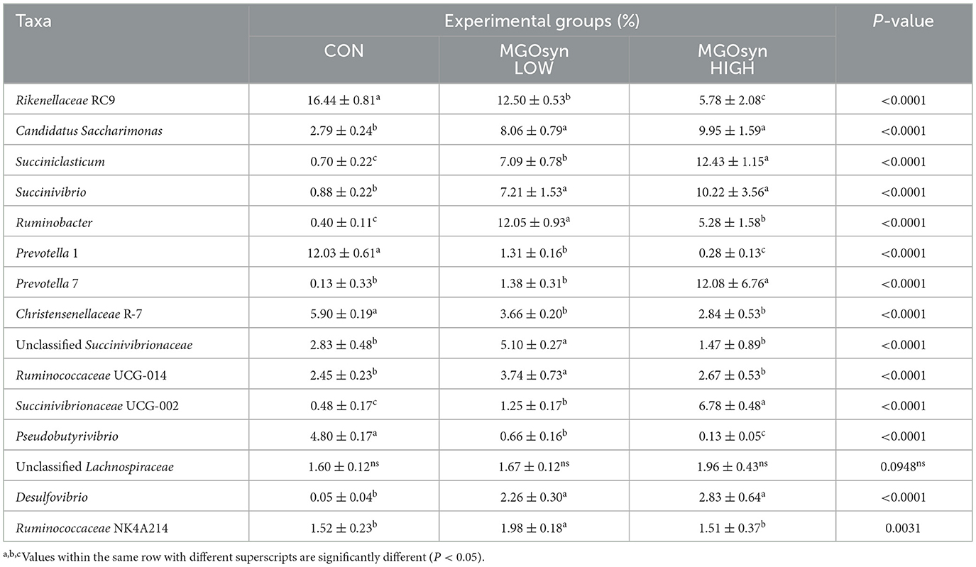 The α-diversity indices, including the Shannon (richness and evenness) and Simpson (dominance and evenness) indices of the bacterial community, were significantly influenced by MGOsyn supplementation (P < 0.0001; Figure 2A, Table 2). Furthermore, β-diversity analysis at the genus level revealed that the control samples clustered separately from the MGOsyn supplemented groups (F = 26.539, P < 0.001; Figure 2C). MGOsyn supplementation resulted in a notable increase in Succinivibrio at the genus level indicating an overall alteration in the microbial community structure. This increase was significant compared with that in the control (< 1%), MGOsyn LOW (7%), and MGOsyn HIGH (10%) groups (P < 0.0001). Similarly, the relative abundance of Succiniclasticum increased in the MGOsyn LOW (7%) and MGOsyn HIGH (12%) groups compared with that in the control (< 1%; P < 0.0001). The relative abundance of Candidatus Saccharimonas increased in the MGOsyn LOW (8%) and MGOsyn HIGH (10%) groups compared with that in the control (3%; P < 0.0001). Rikenellaceae RC9 and Prevotella 1 were significantly decreased in the MGOsyn supplemented groups compared with the control, whereas Prevotella 7 was increased in the MGOsyn HIGH (12%) group relative to the control (< 1%; P < 0.0001; Figures 3, 4, Table 3).