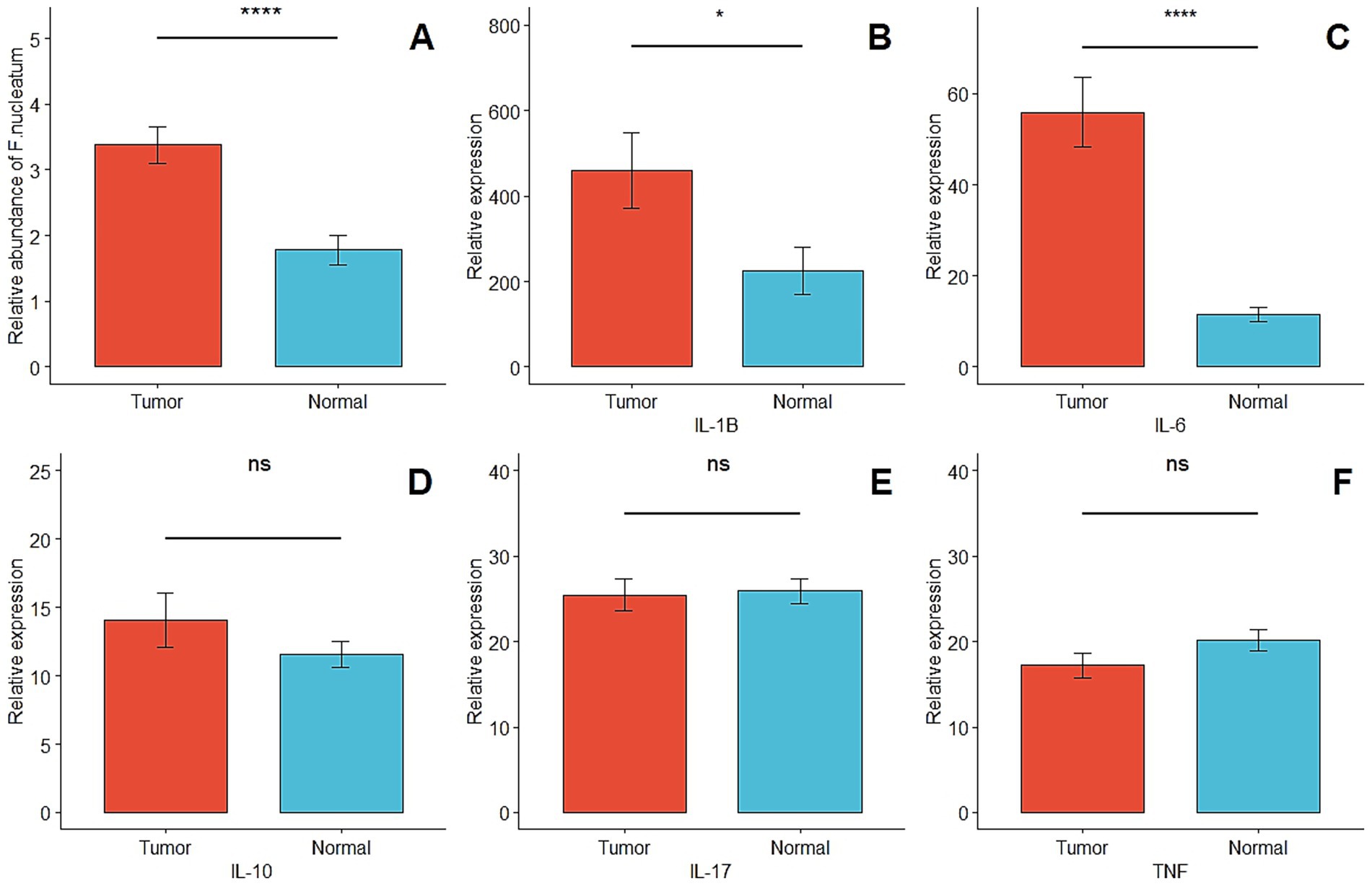 Bar charts A to F compare tumor and normal tissue samples. Chart A shows higher relative abundance of F. nucleatum in tumors. Charts B and C show significantly higher expression of IL-1B and IL-6 in tumors. Charts D, E, and F indicate no significant difference in IL-10, IL-17, and TNF expression between tissues. Statistical significance is marked by asterisks or