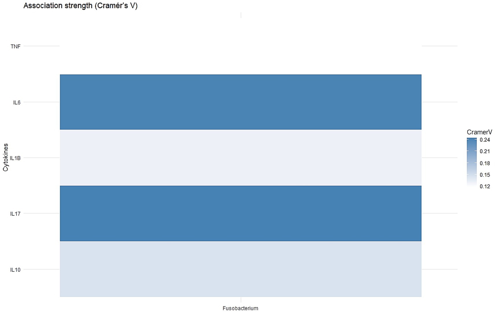 Bar chart illustrating association strength using Cramér’s V between Fusobacterium and various cytokines: TNF, IL6, IL1B, IL17, and IL10. A color gradient from light to dark blue indicates strength, with values from 0.12 to 0.24.