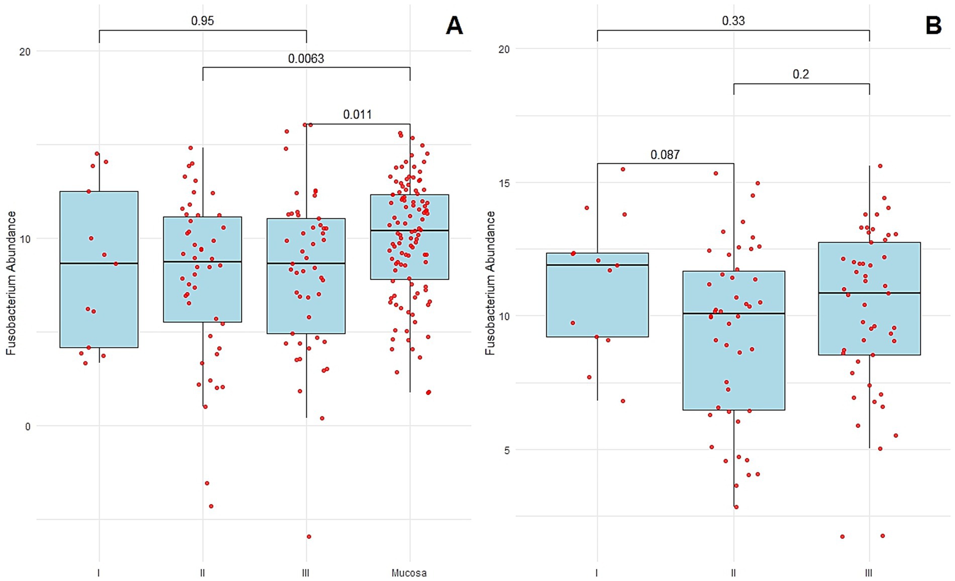 Box plots depict the abundance of Fusobacterium across different categories. Panel A shows four groups: mucosa and three other categories, with significance levels marked between groups. Panel B displays three groups, also with significance levels noted. Red dots represent data points, and p-values indicate statistical differences.