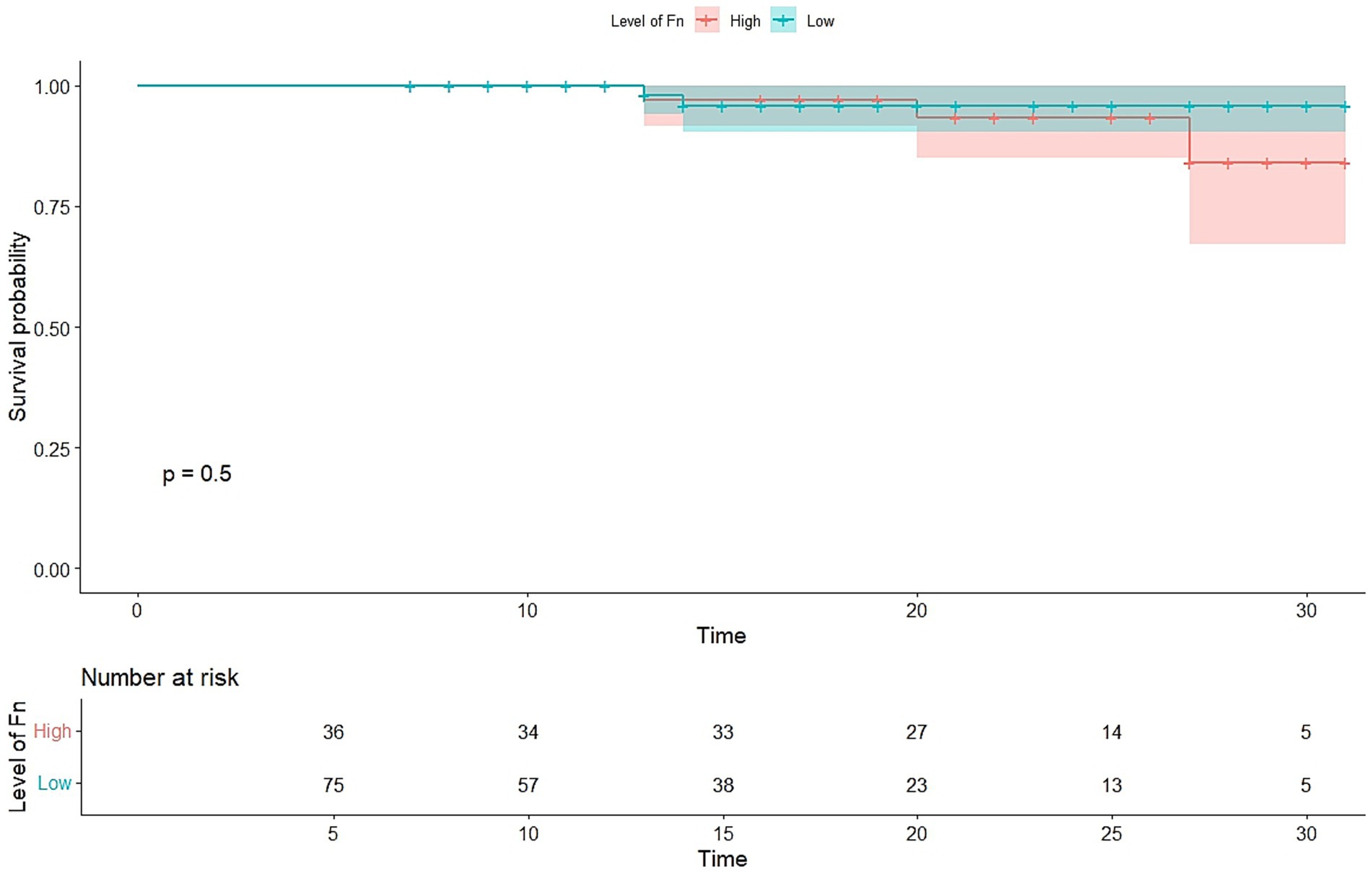 Kaplan-Meier survival curve comparing high and low levels of Fn. The x-axis represents time, and the y-axis represents survival probability. Shaded areas show confidence intervals. Data table below shows numbers at risk over time. The p-value is 0.5.