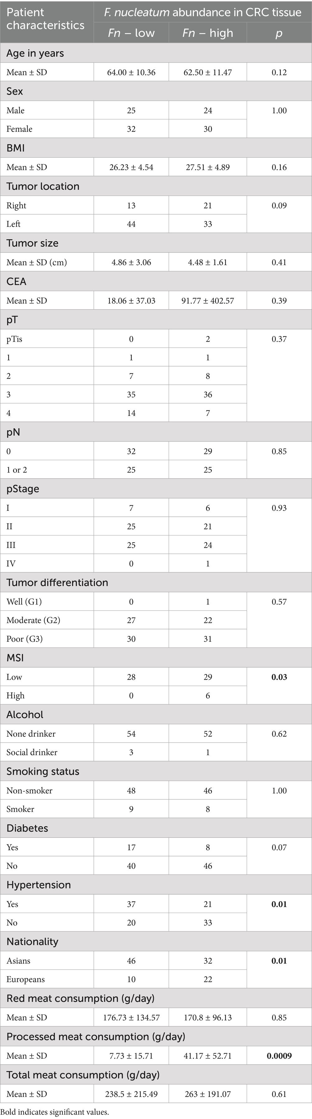 The dietary findings are particularly compelling. More recent studies have reported that the association between Fusobacterium nucleatum and colorectal cancer (CRC) appears to be stronger in Asian populations compared to those in Europe or North America (Nishijima et al., 2016; Huang et al., 2018; Janati et al., 2020). Patients with high processed meat intake showed significantly higher F. nucleatum levels, supporting existing evidence that Western-style diets rich in processed meats may promote a tumor microenvironment favorable to F. nucleatum. In contrast, previous literature suggests that diets high in fiber and plant-based foods are protective against Fn-positive CRC, likely due to their beneficial effects on gut microbiota composition. These dietary patterns play a significant role in shaping the composition and diversity of the colonic microbiota. Importantly, maintaining a balance between health-promoting and harmful microbial metabolites plays a critical role in modulating CRC risk (Zhang et al., 2018; Leng et al., 2018). Nonetheless, further research is needed to explore these associations in greater depth, taking into account a wider range of contributing factors.