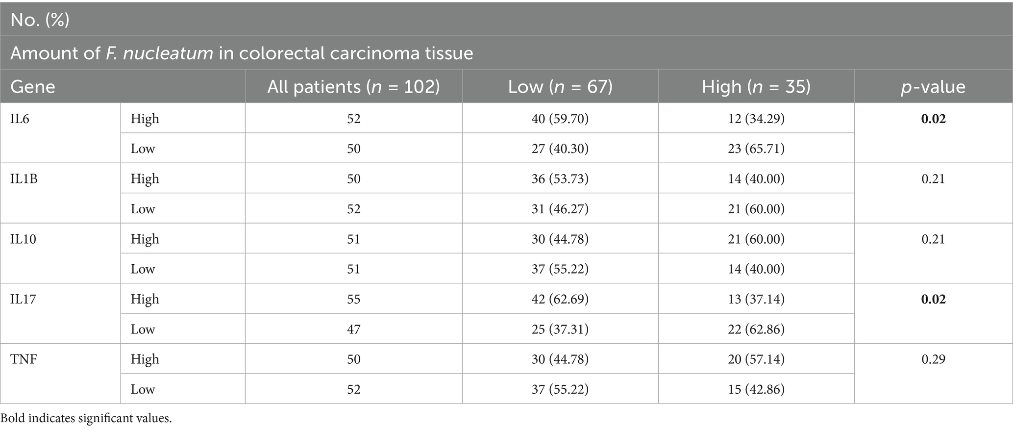 Our findings did not reveal a significant increase in IL-17 expression levels in CRC tissues compared to matched normal tissues. But we demonstrated positive significance correlation of expression level of IL-17with high abundance of F. nucleatum in tumor tissue. This finding is consistent with previous studies demonstrating the role of IL-17 in the development and progression of CRC (Feng et al., 2019; Lin et al., 2015). In hepatocellular carcinoma, particularly in alcohol-related liver disease, IL-17–mediated activation of hepatocytes and macrophages drives inflammation and tumor development, while pathway inhibition attenuates these effects (Ma et al., 2020).