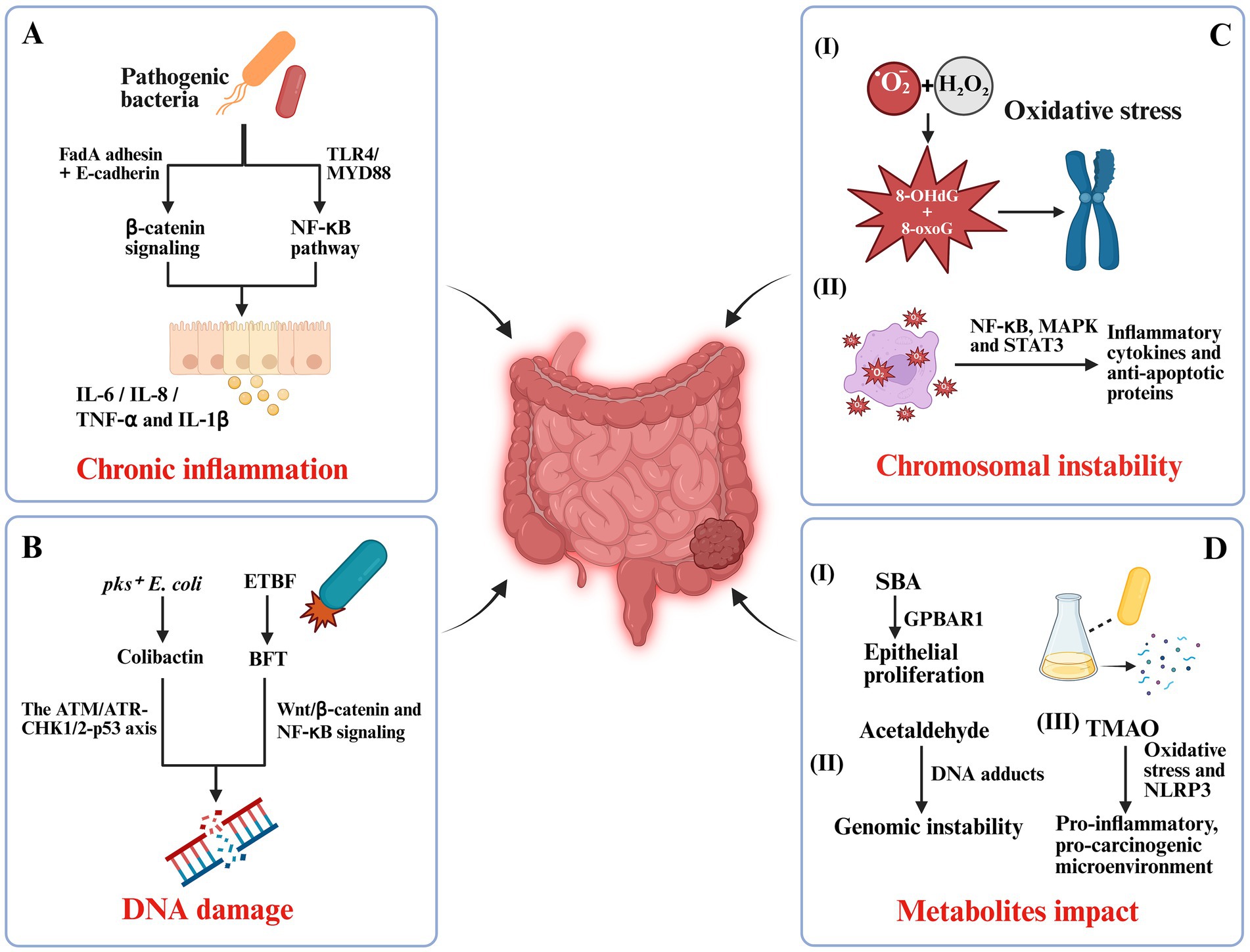 In the following sections, we delineate four core mechanistic pathways underlying the contribution of gut microbes to colorectal tumorigenesis: (i) chronic inflammation driven by pathogenic bacteria; (ii) DNA damage induced by bacterial genotoxins; (iii) oxidative stress-mediated chromosomal instability; and (iv) the oncogenic influence of microbial metabolites.