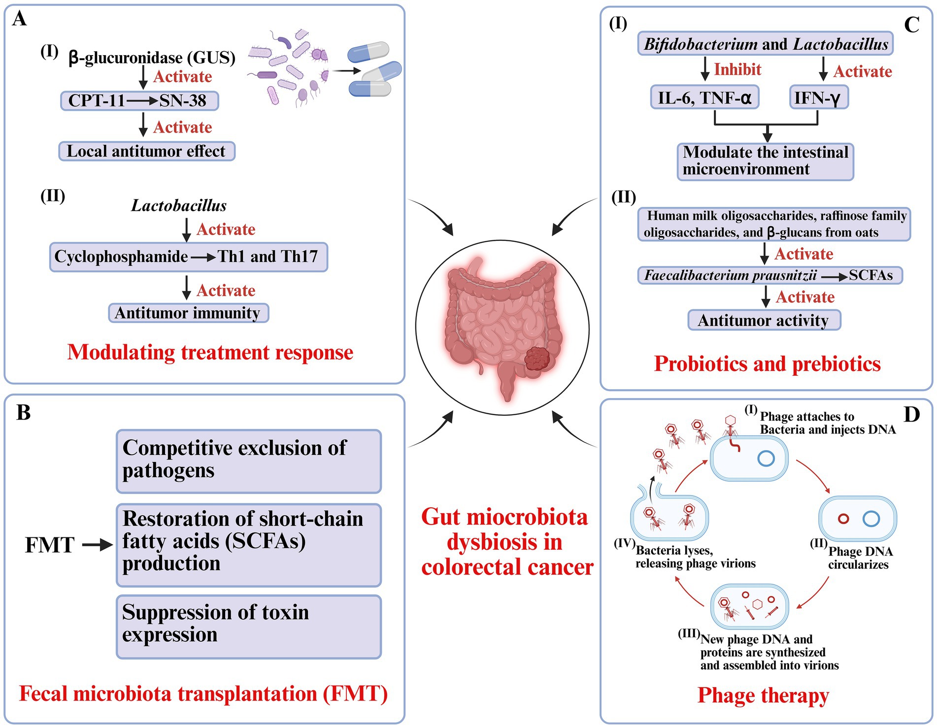 Figure 2. Microbiota-based therapeutic strategies in colorectal cancer. (A) Modulation of treatment responses: Gut microbial β-glucuronidase (GUS) reactivates irinotecan metabolite SN-38, enhancing local antitumor effects but contributing to toxicity. Lactobacillus augments cyclophosphamide-induced Th1/Th17 responses and antitumor immunity. (B) Fecal microbiota transplantation (FMT): Restores gut homeostasis by excluding pathogens, reestablishing short-chain fatty acid (SCFA) production, and suppressing toxin expression. (C) Probiotics and prebiotics: Bifidobacterium and Lactobacillus modulate cytokine expression, strengthen intestinal barrier function, and promote SCFA-producing bacteria (Faecalibacterium prausnitzii), supporting antitumor immunity. (D) Phage therapy: Bacteriophages selectively lyse pathogenic bacteria through infection cycles, reducing tumor-promoting microbes while sparing commensals.