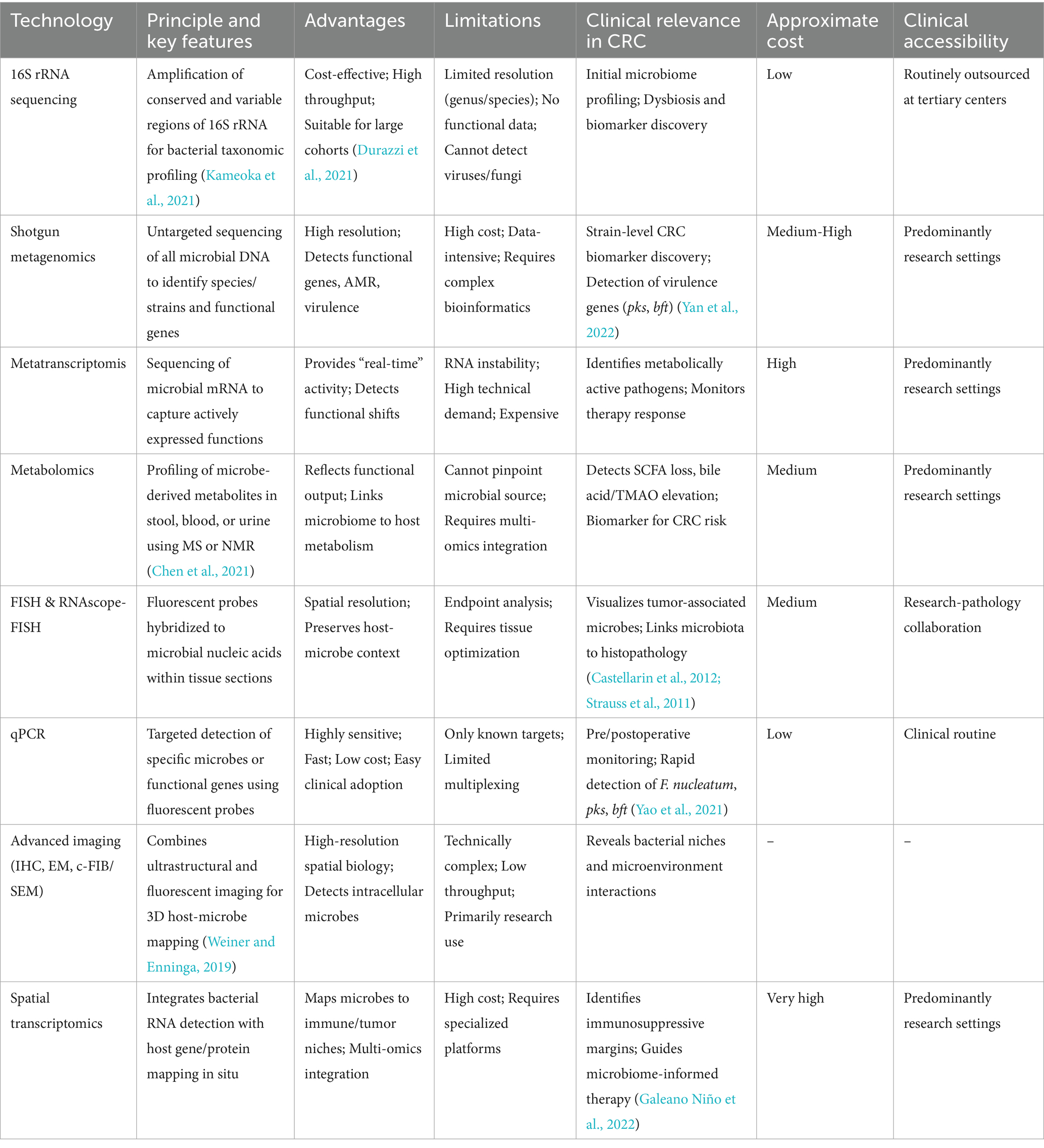 Advances in molecular biology and multi-omics have dramatically expanded our ability to characterize the gut microbiome, enabling both taxonomic and functional profiling of microbial communities (Deissova et al., 2023). These methods have not only deepened our understanding of microbial contributions to CRC but also opened avenues for early detection, therapeutic monitoring, and precision interventions. Contemporary microbiome detection strategies can be broadly categorized into nucleic acid-based sequencing, functional and metabolic analyses, and imaging-based spatial profiling (Table 1).