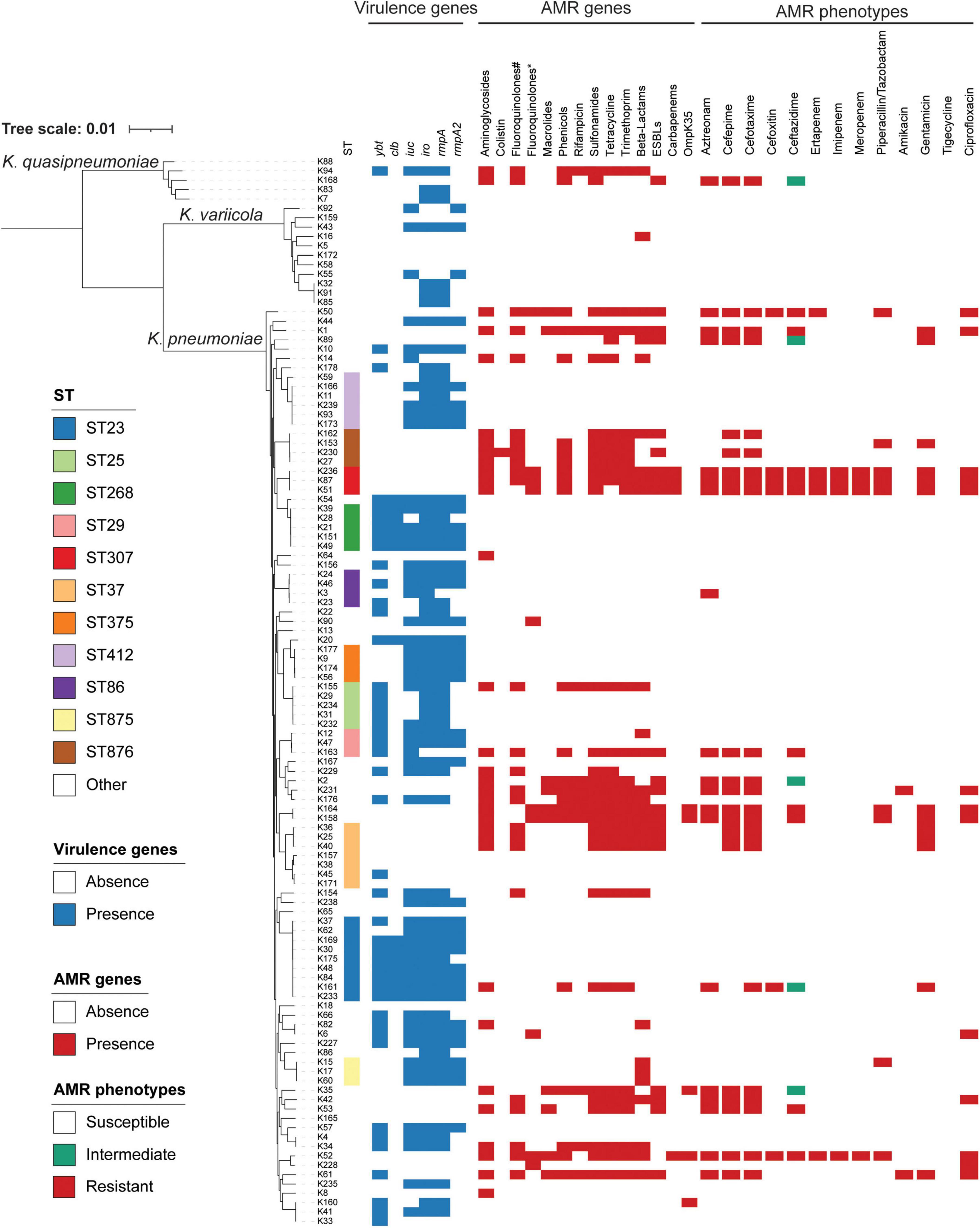 Figure 1. Phylogenetic analysis of 114 isolates. ST, virulence genes, AMR genes, and AMR phenotypes are indicated in different colors. The presence of OmpK35 stands for the mutation of OmpK35. ST, sequence typing; AMR, antimicrobial resistance; #fluoroquinolone resistance genes; *mutations found in the quinolone-resistance determining regions of GyrA and ParC.